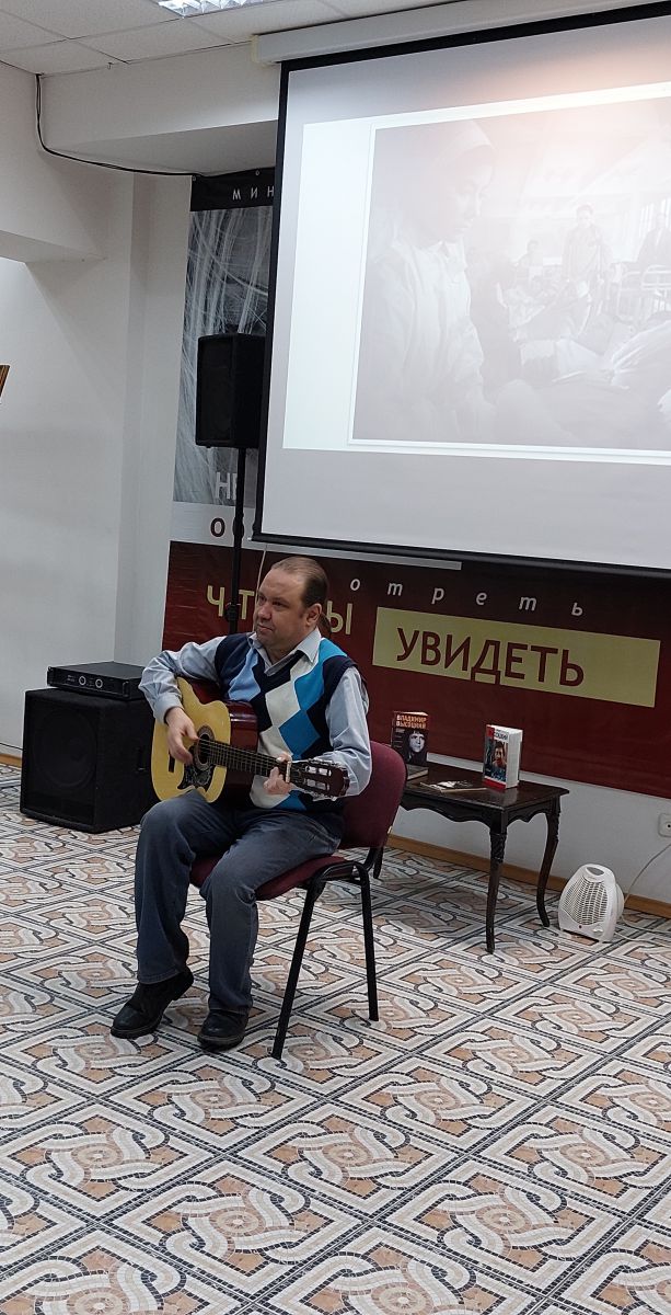 Легенда авторской музыки, актер театра и кино, Владимир Высоцкий был кумиром миллионов. На вечере памяти прозвучали стихи и песни Высоцкого в исполнении читателей библиотеки и приглашённых гостей. Читателям напомнили о темах, пронизывающих всё творчество Высоцкого: спорт, любовь, Родина, а также Великая Отечественная война. Тема Великой Отечественной войны занимает центральное место в творчестве Высоцкого. Он знал о войне по рассказам отца, Семёна Владимировича, который прошел ее от начала до конца, награжден 28-ю орденами и медалями. Высоцкий посвятил войне более полусотни стихотворений и песен, глубоко прочувствовав ее трагизм и жестокость – погибшие за Отечество должны остаться в вечной памяти народа.