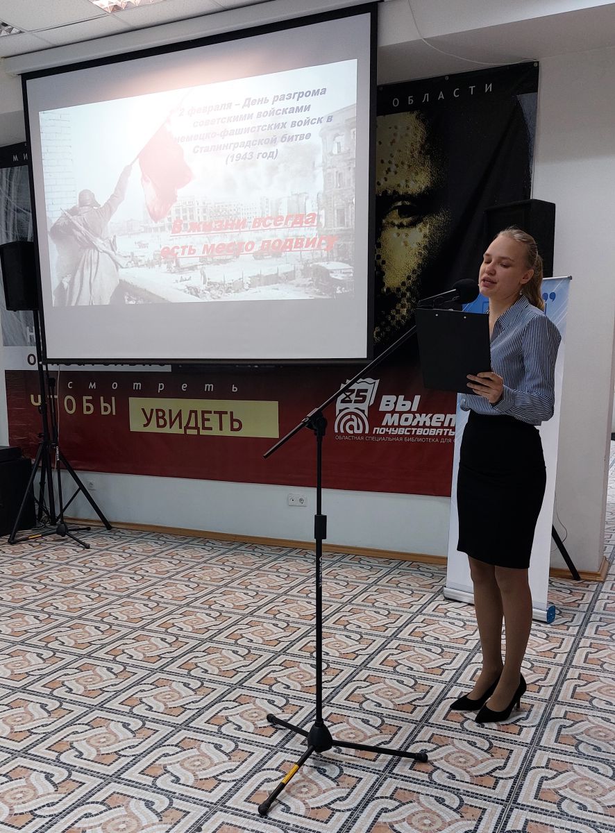 2 февраля отмечается День воинской славы России – День разгрома советскими войсками немецко-фашистских войск в Сталинградской битве. К 81-й годовщине Сталинградской Победы в Областной специальной библиотеке для слепых прошёл урок мужества «В жизни всегда есть место подвигу». Участниками стали ученики 4 класса Лицея-интерната естественных наук (ЛИЕН). Дети узнали об одной из самых трагических страниц в истории Великой Отечественной войны 1941-1945 гг. – битве под Сталинградом, о великом мужестве защитников города. С огромным интересом учащиеся посмотрели отрывки из документального фильма «Сталинградская битва», в который вошли невероятные кадры хроники военных действий Красной Армии в Сталинграде. После просмотра ребята с воодушевлением отвечали на вопросы ведущей о родственниках-участниках Великой Отечественной войны 1941 – 1945 гг. и продемонстрировали свои знания об этом событии.