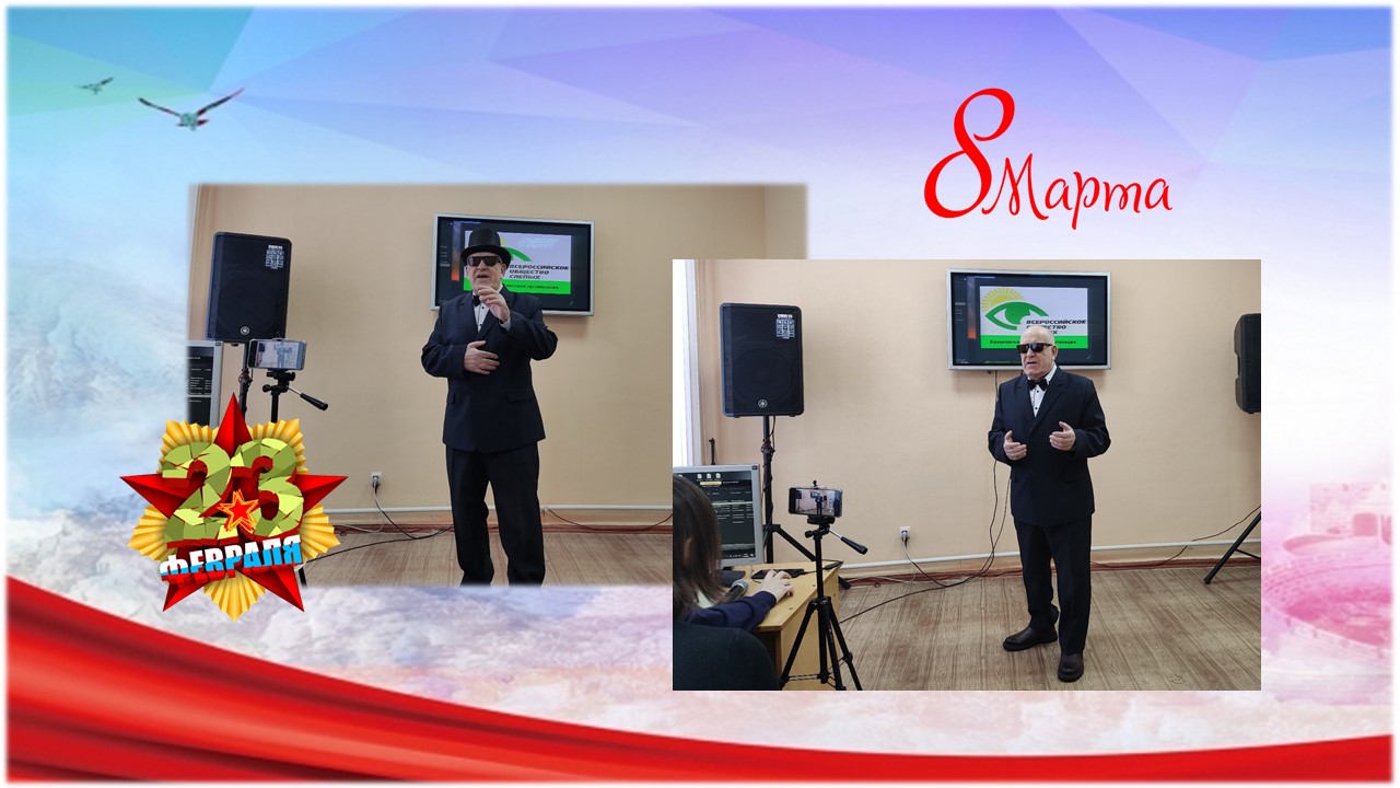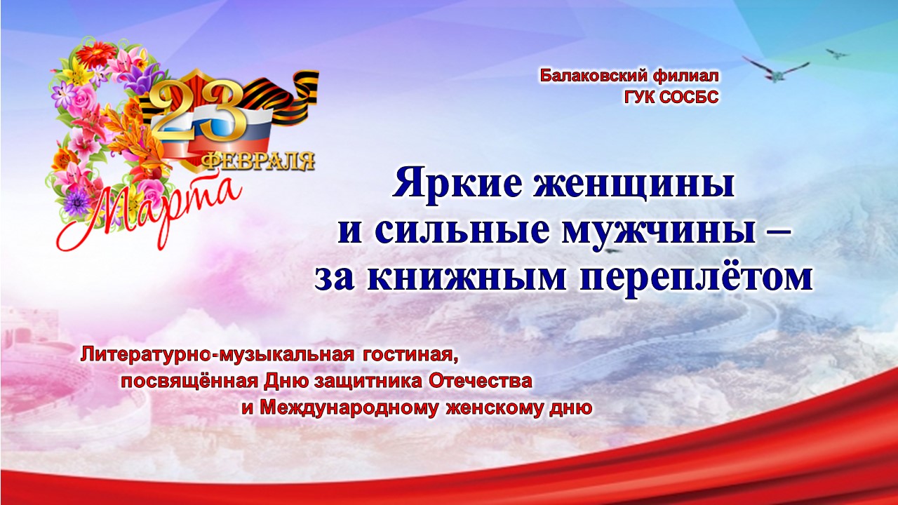 Литературно-музыкальная гостиная «Яркие женщины и сильные мужчины — за книжным переплётом» рассказала об истории праздников — Дня защитника Отечества и Международного женского дня — и предложила вспомнить литературные и музыкальные произведения о героях-защитниках и прекрасных женщинах в русской литературе и истории. Одноимённая выставка была посвящена мужественным защитникам своей семьи, друзей, Родины и всех, кто нуждается в помощи, а также представительницам прекрасной половины человечества – великим женщинам разных эпох, внесших свой вклад в историю страны. Выставка содержала литературно-художественную и научно-популярную литературу по теме на разных носителях; иллюстрации.