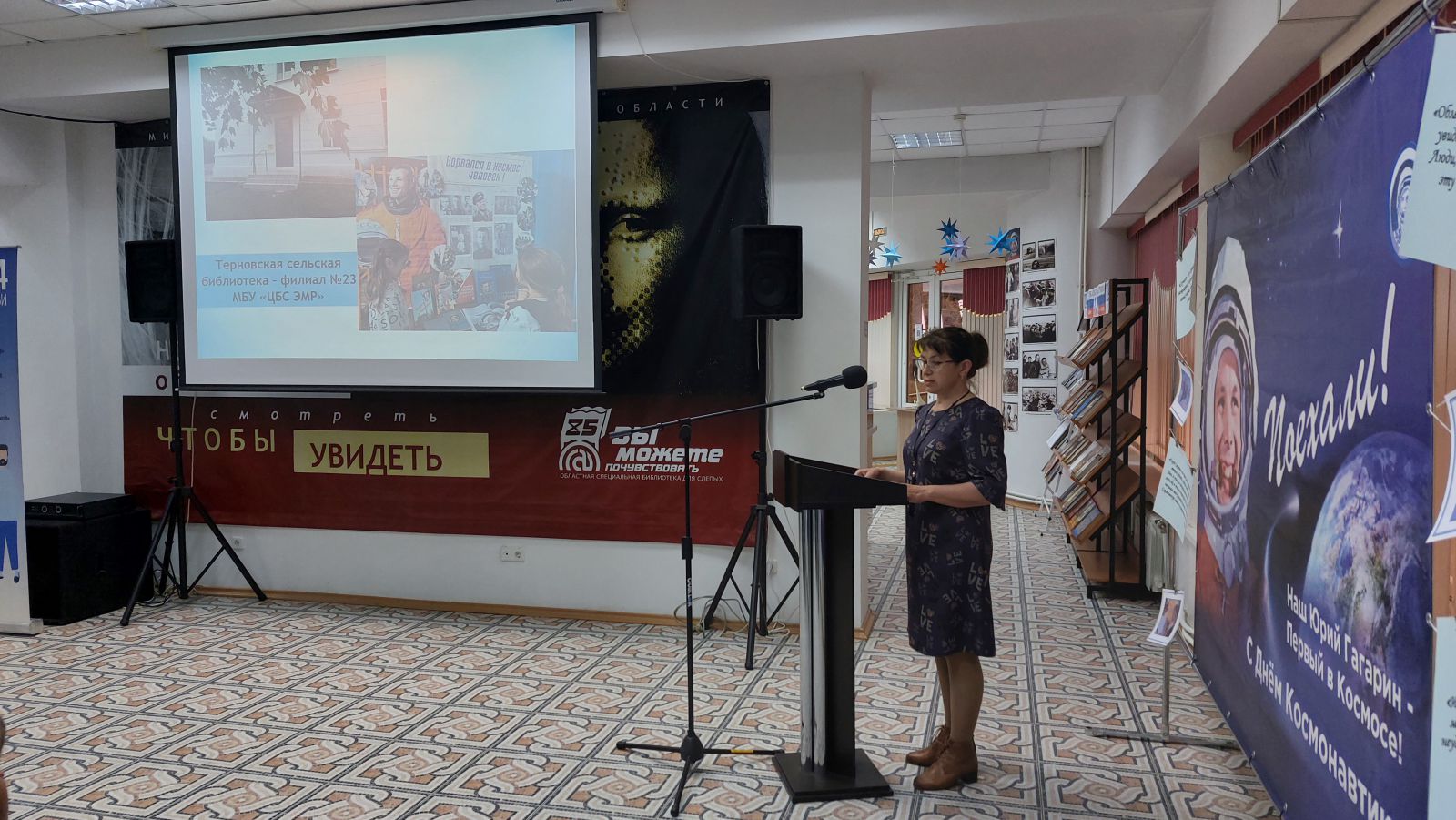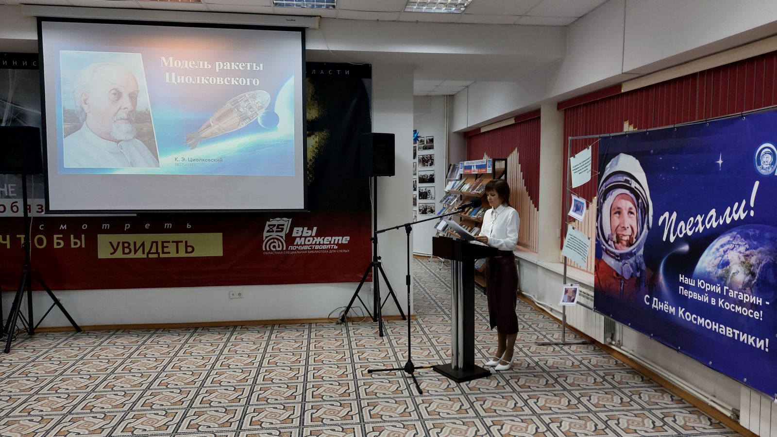 Завершилось торжественное открытие Гагаринских чтений, началась деловая часть. Первым докладом прозвучал доклад директора ГУК «Областная специальная библиотека для слепых» Ольги Новиковой «Гагарин. Дорога в космос: из опыта работы Областной специальной библиотеки для слепых». Открылся доклад цитатой о том, что именно книга проложила путь к звёздам. Особое внимание было уделено заслугам библиотековеда, родоначальника русского космизма Николая Фёдорова и его знакомству в библиотеке с Циолковским. Рассказано о встрече Сергея Королёва и Юрия Гагарина. Были представлены: работа по программе «Пушкинская карта» – квиз, посвящённый 90-летию Юрия Гагарина, тифлотурне, работа по инватуризму, интересный опыт работы филиалов библиотеки.