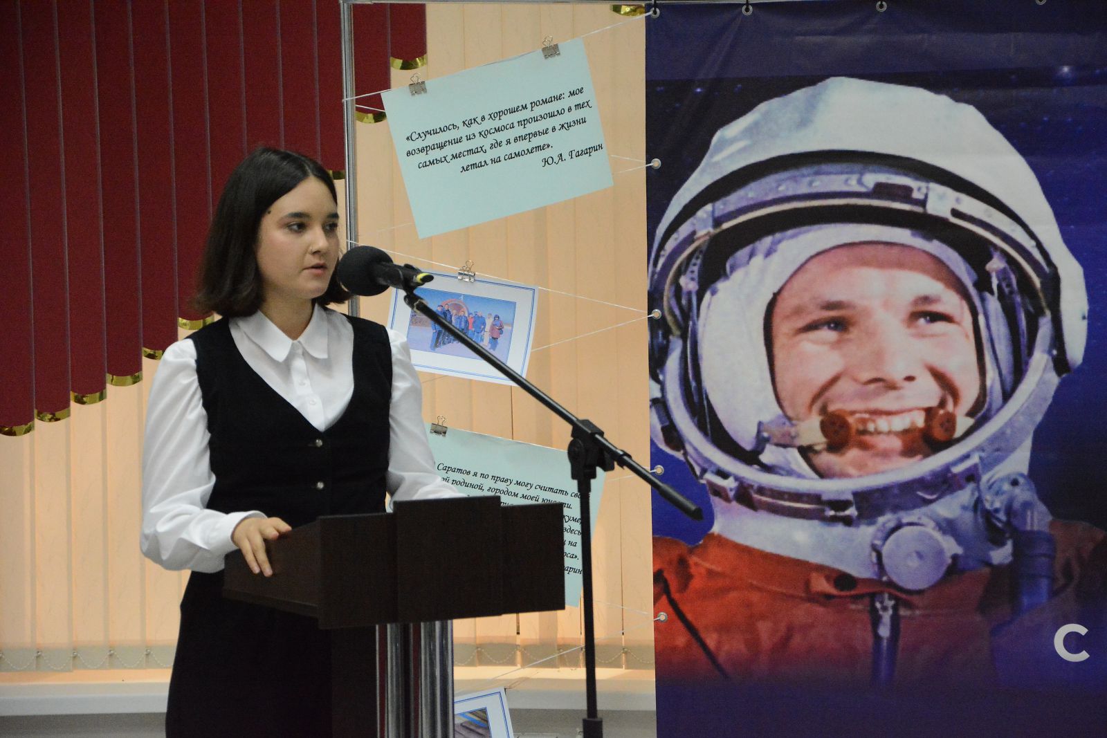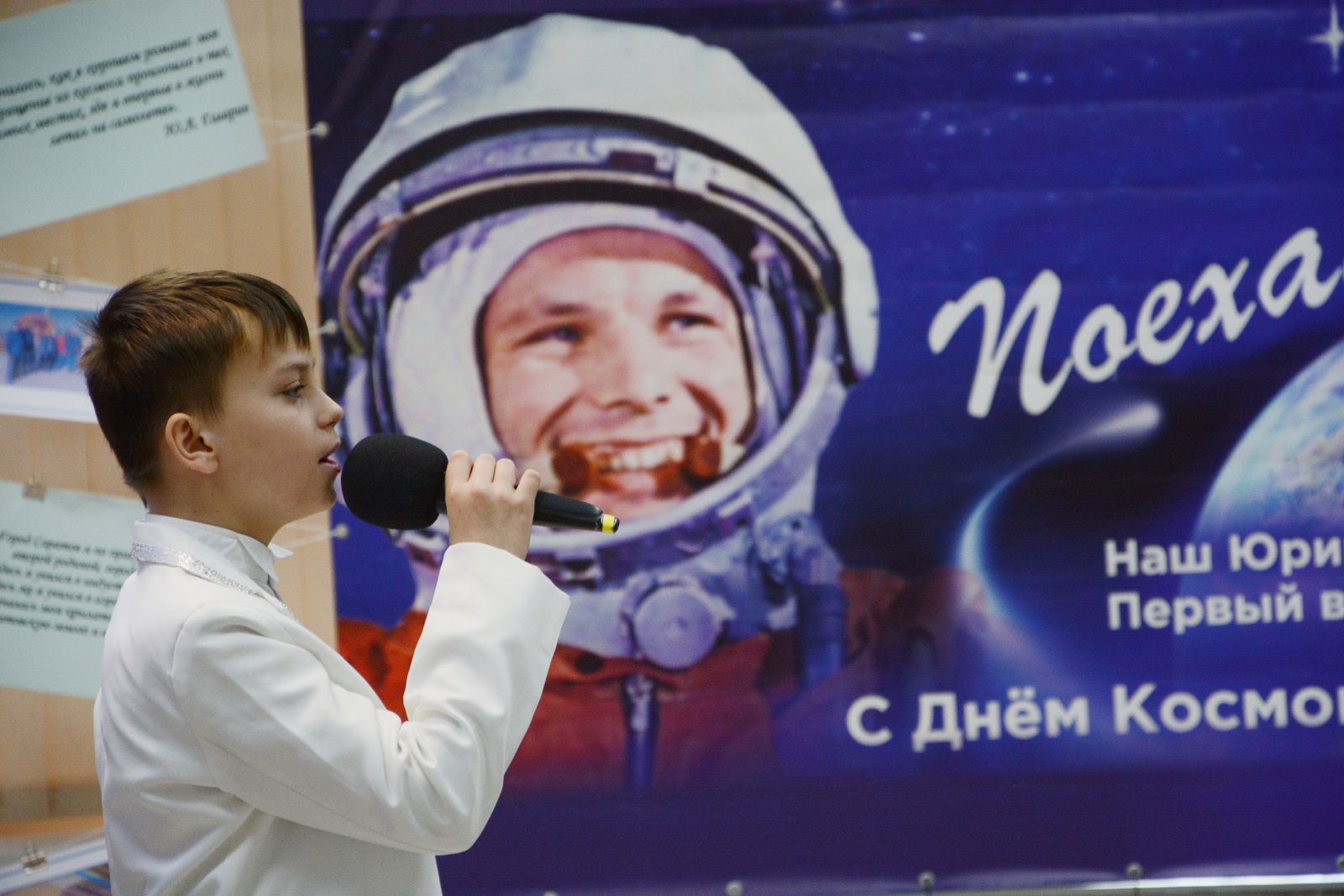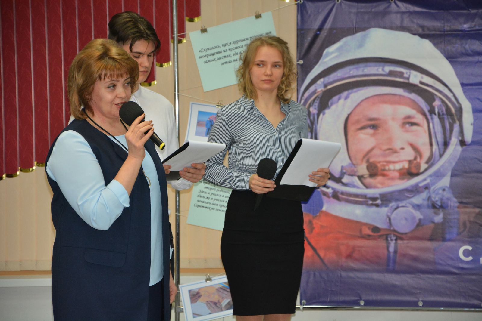 В 10:00 прозвучали фанфары. Открылись Гагаринские чтения выступлением солиста «Народного коллектива» вокально-эстрадного ансамбля «Сюрприз» Саратовского Областного дома работников искусств Богдана Никитина с песней «Этот большой мир!».