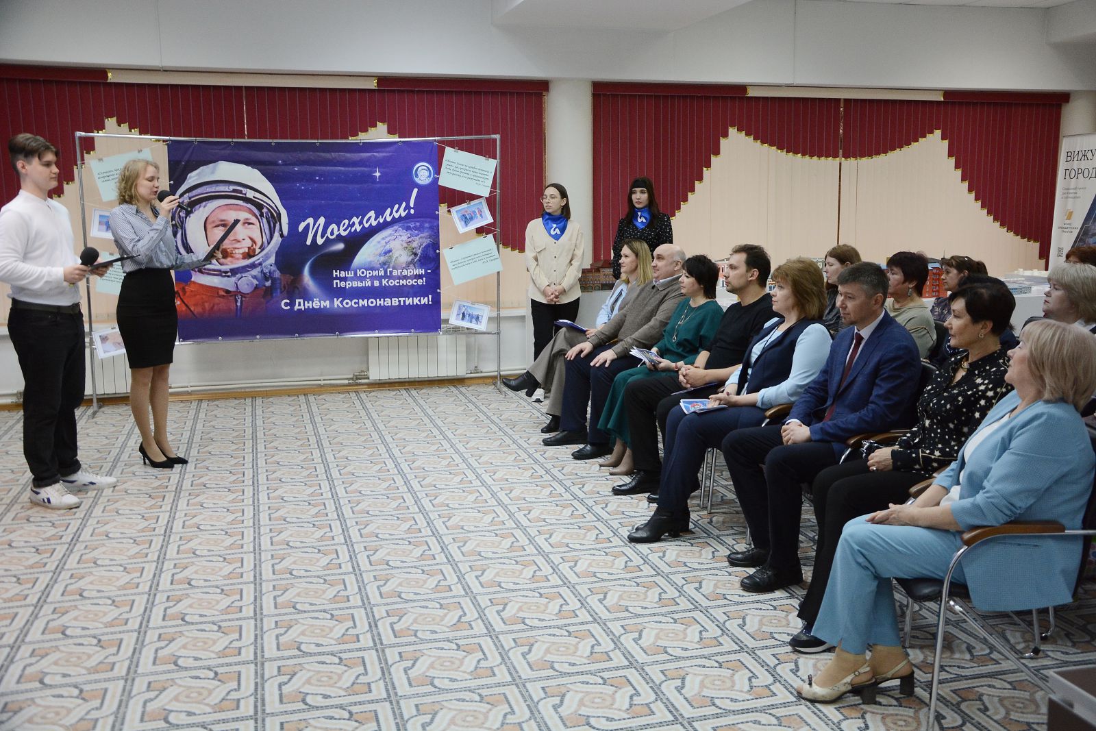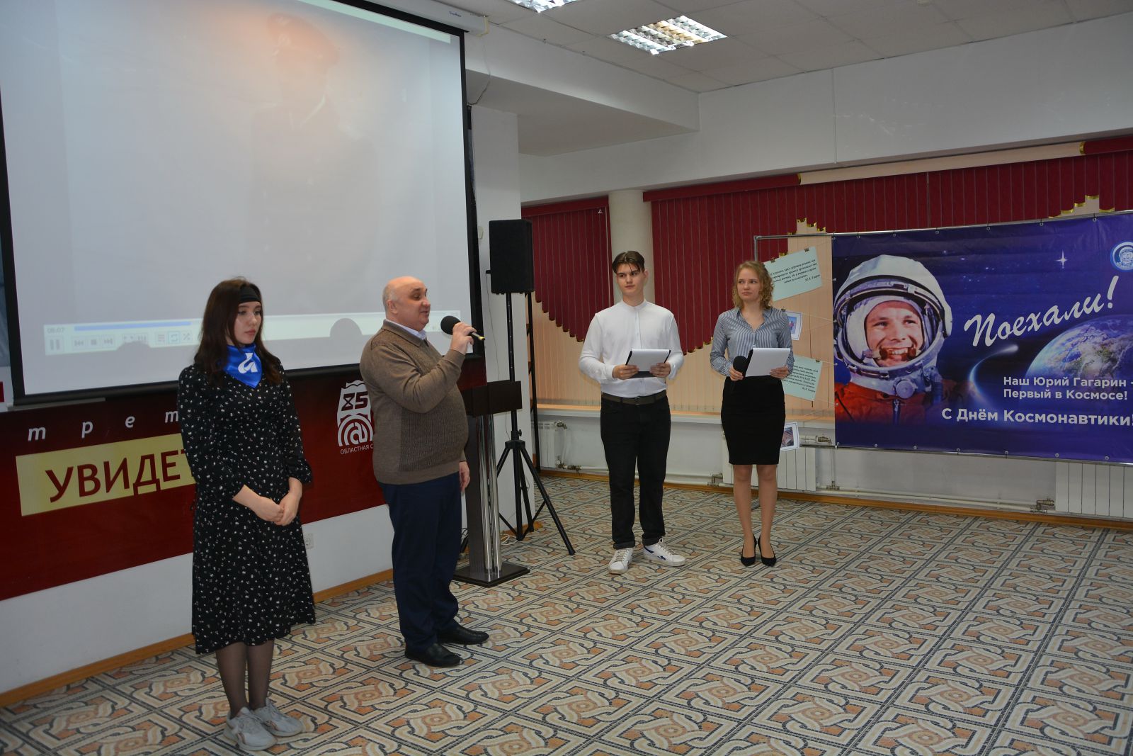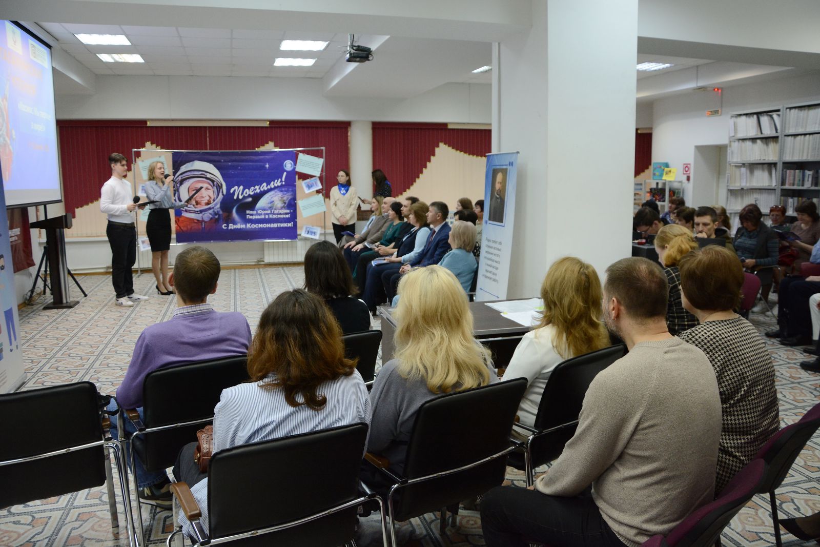 Ведущие поприветствовали всех участников Гагаринских чтений в онлайн и офлайн формате. Участниками чтений стали коллеги из более чем 80 регионов, среди них Луганская Республиканская Универсальная Научная Библиотека им. М. Горького, Белгородская государственная универсальная научная библиотека, Белгородская государственная специальная библиотека для слепых имени В.Я. Ерошенко, Донецкая республиканская универсальная научная библиотека имени Н.К. Крупской, Донецкая республиканская библиотека имени С.М. Кирова, Карагандинская областная спецбиблиотека для незрячих и слабовидящих граждан.