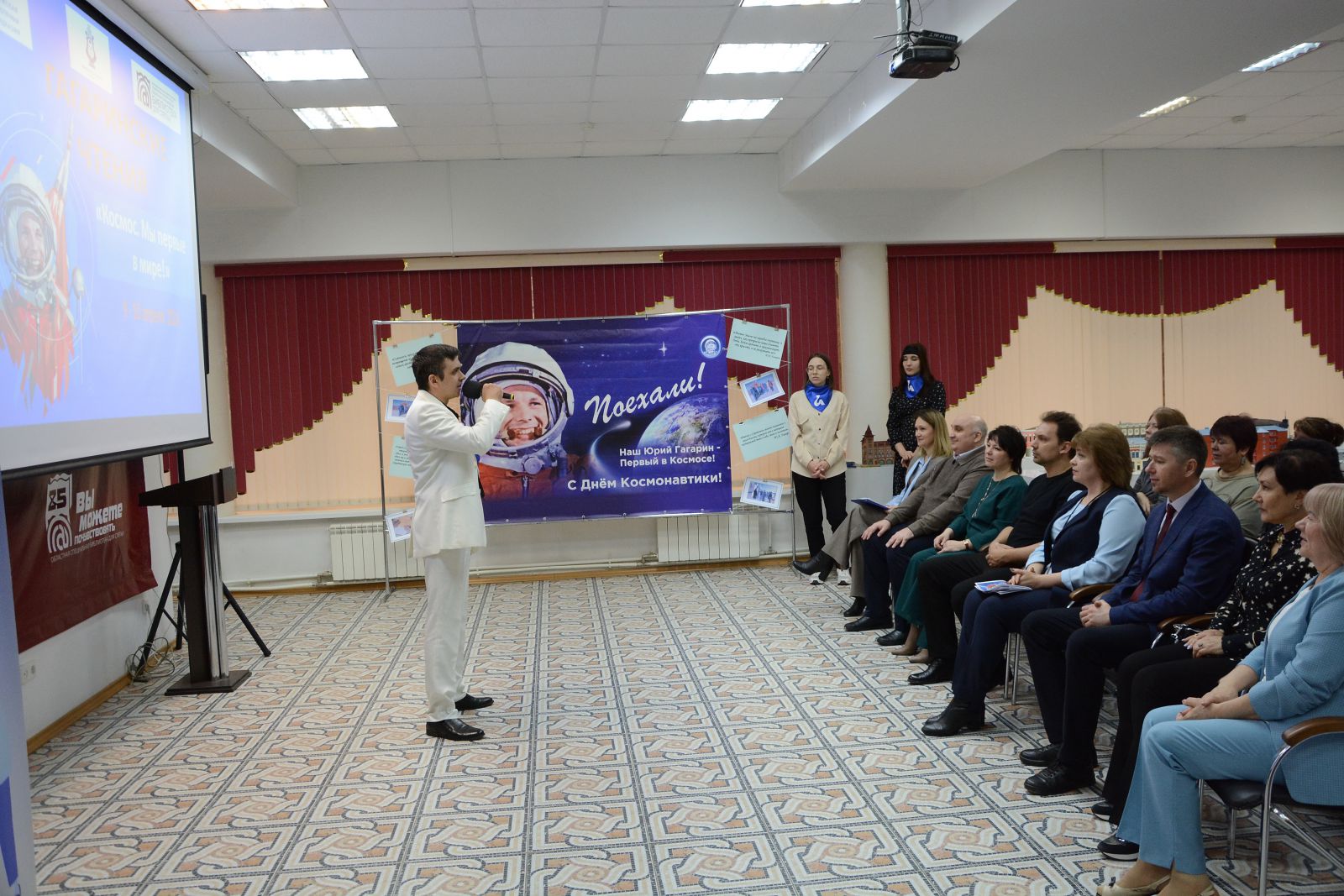 От имени министра культуры Саратовской области Наталии Юрьевны Щелкановой участников чтений поприветствовал Сергей Рубцов, референт отдела социокультурной деятельности, библиотек, музеев и кино министерства культуры Саратовской области. Он отметил, что дорога в космос Юрия Алексеевича Гагарина началась с Саратова. Сам Гагарин называл Саратов своей второй Родиной.