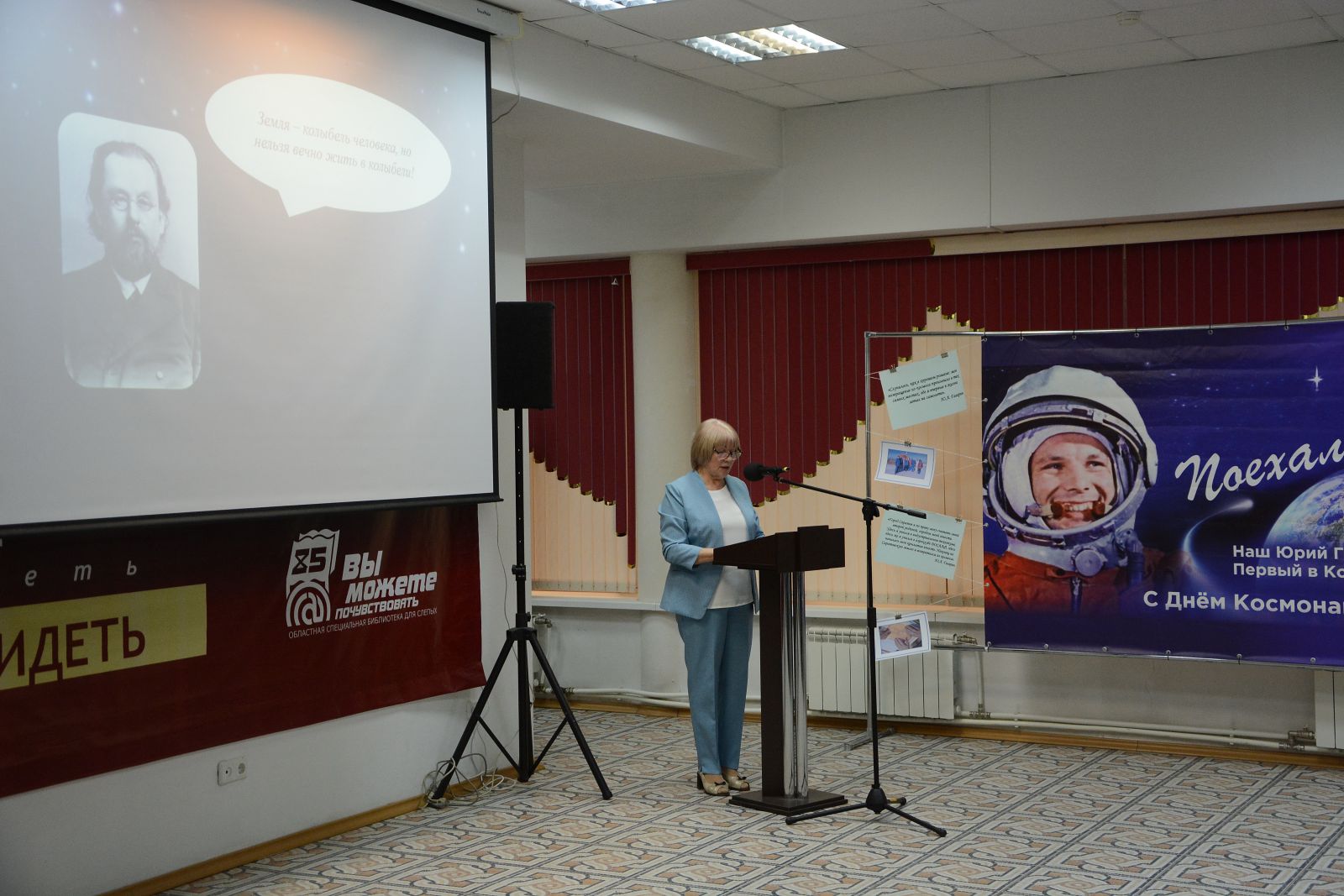 Директор ГУК «Областная специальная библиотека для слепых» Ольга Новикова обозначила, что наша библиотека стала центром притяжения единомышленников, которых объединил Юрий Алексеевич Гагарин. Именно Гагарин стал символом безграничных возможностей, покорив космос. Его подвиг сплотил людей многих поколений. Сохранение памяти – это главное, для чего мы ежегодно проводим Гагаринские чтения – для того, чтобы помнили, что мы наследники Великой Победы, первооткрывателей космоса, что за нами большая Россия.