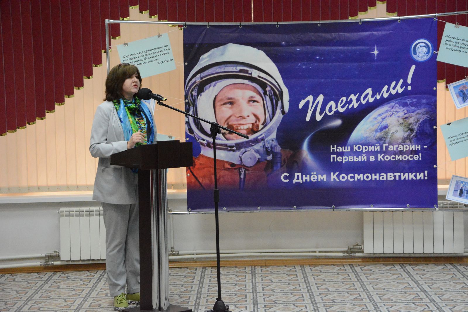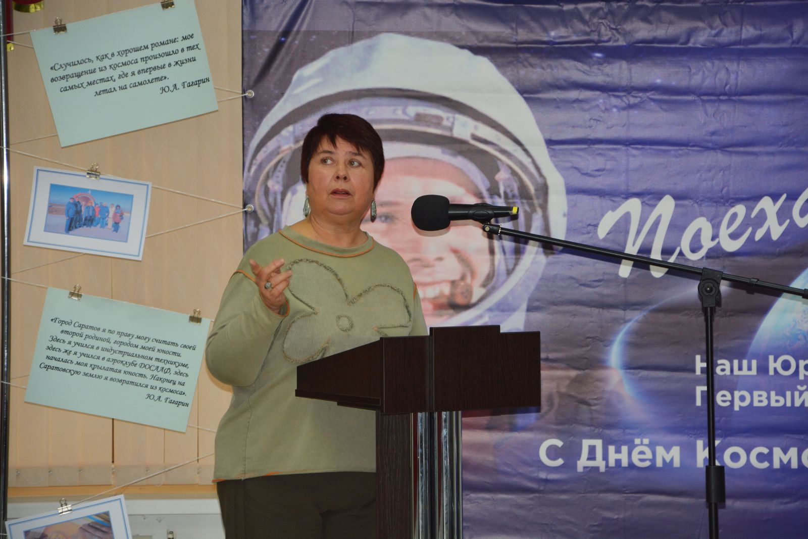 Необычным было приветствие председателя Общественного совета при министерстве культуры Саратовской области Елены Дробышевой в форме красивого стихотворения, посвящённого Гагаринским чтениям. Она обратила внимание на важность Гагаринских чтений. Отметила успешно развивающуюся инклюзивную среду в Областной специальной библиотеке для слепых.