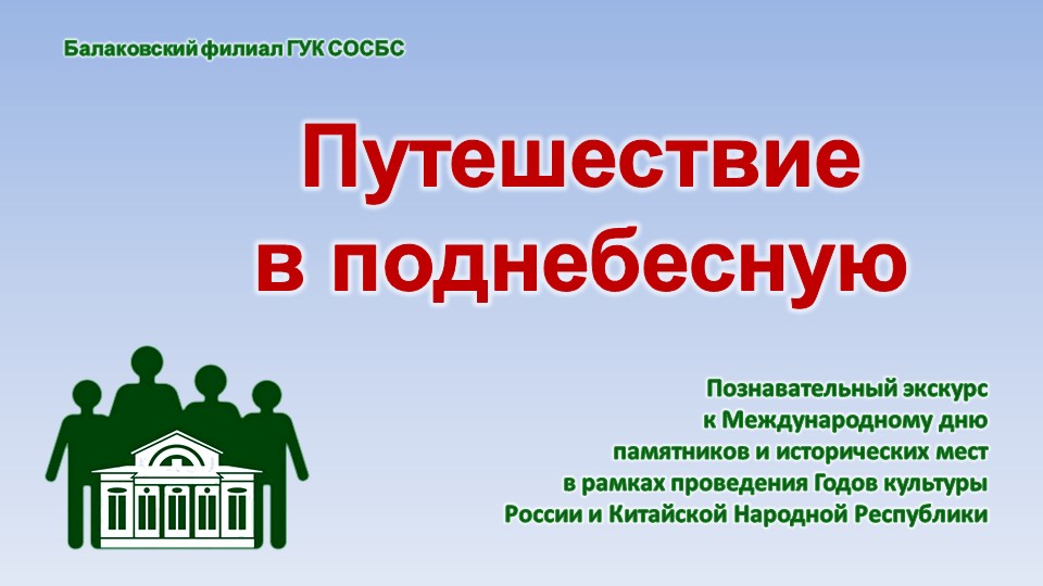 Балаковский филиал Областной специальной библиотеки для слепых провёл познавательный экскурс к Международному дню памятников и исторических мест в рамках проведения Годов культуры России и Китайской Народной Республики для получателей социальных услуг КЦСОНа. Мероприятие «Путешествие в Поднебесную» рассказало об исторических местах и памятниках нашей страны, познакомило с культурой и достопримечательностями Китая, а также о дружбе и сотрудничестве между двумя странами.