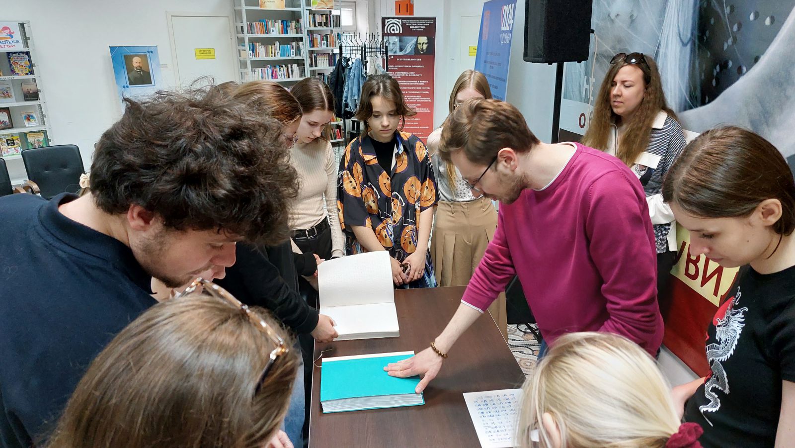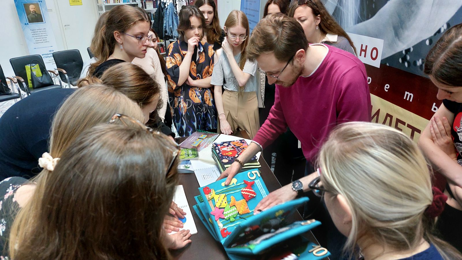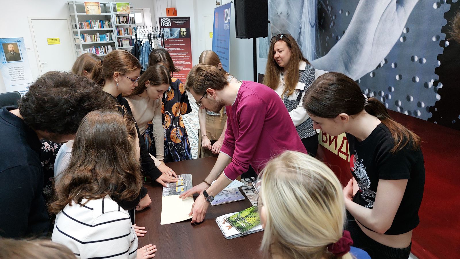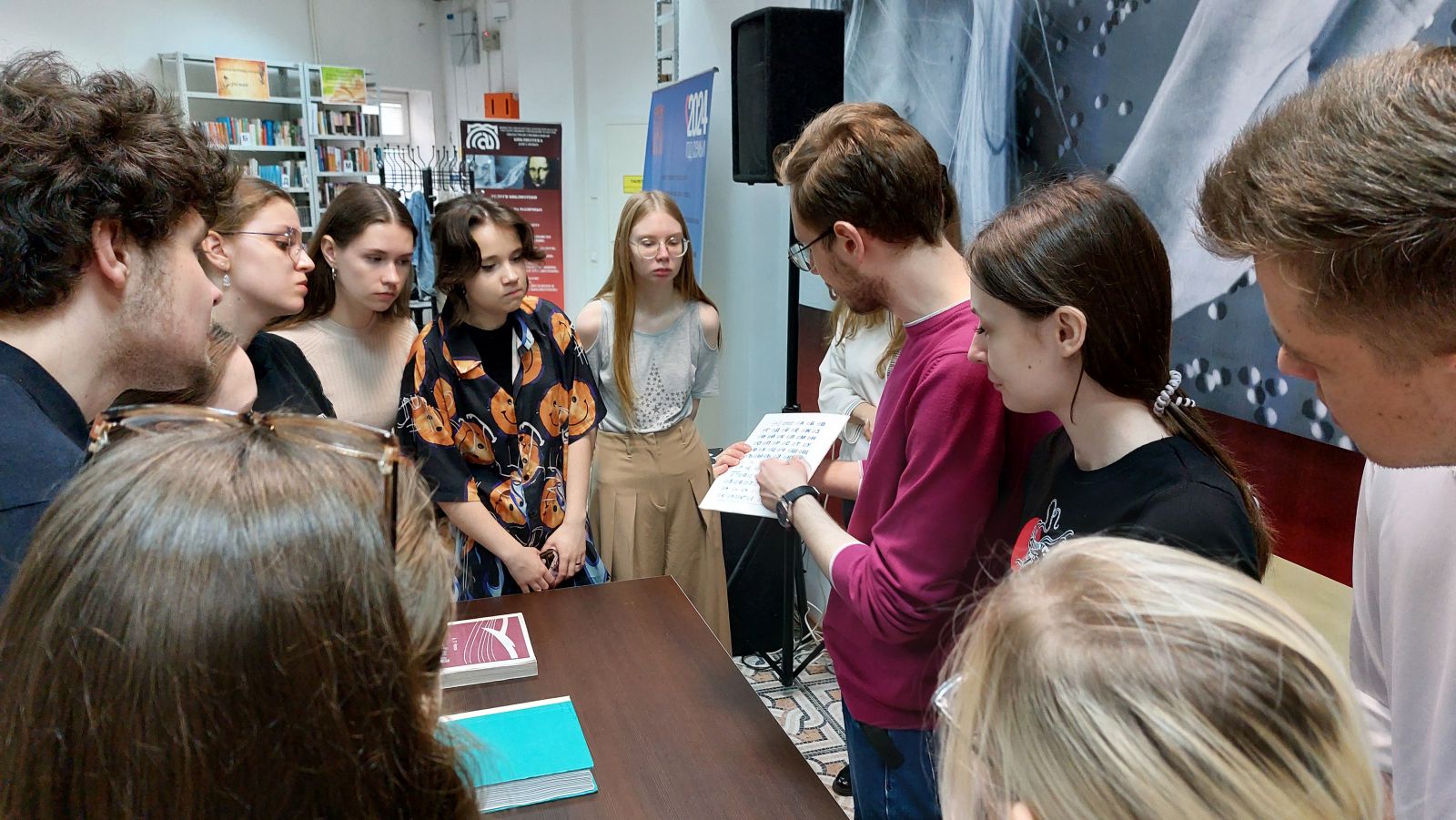 Ведущие рассказали, как незрячие люди читают и пишут, студенты познакомились с книгами, напечатанными рельефно-точечным шрифтом Брайля.