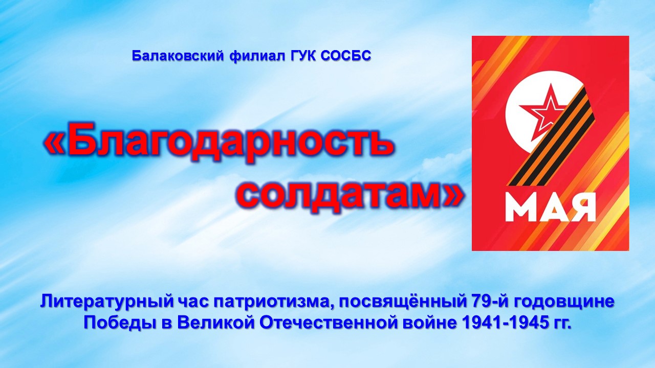 Балаковский филиал Областной специальной библиотеки для слепых посвятил литературный час патриотизма «Благодарность солдатам» подвигу советского народа в Великой Отечественной войне, героизму взрослых и детей, воевавших на фронте и в тылу за мирное небо над головой.
