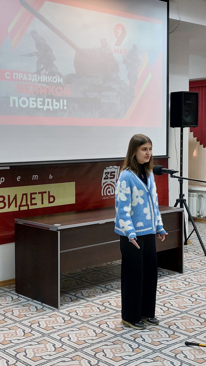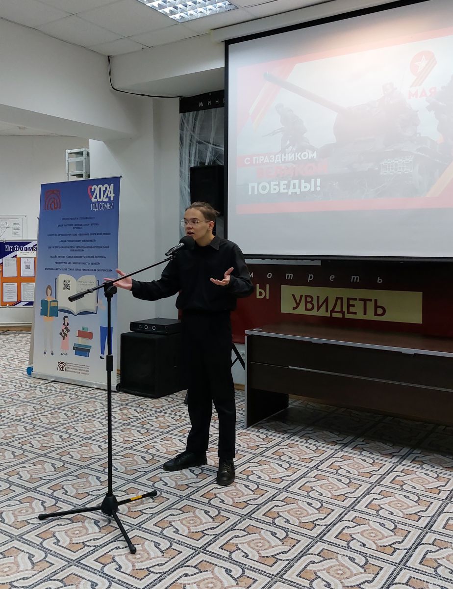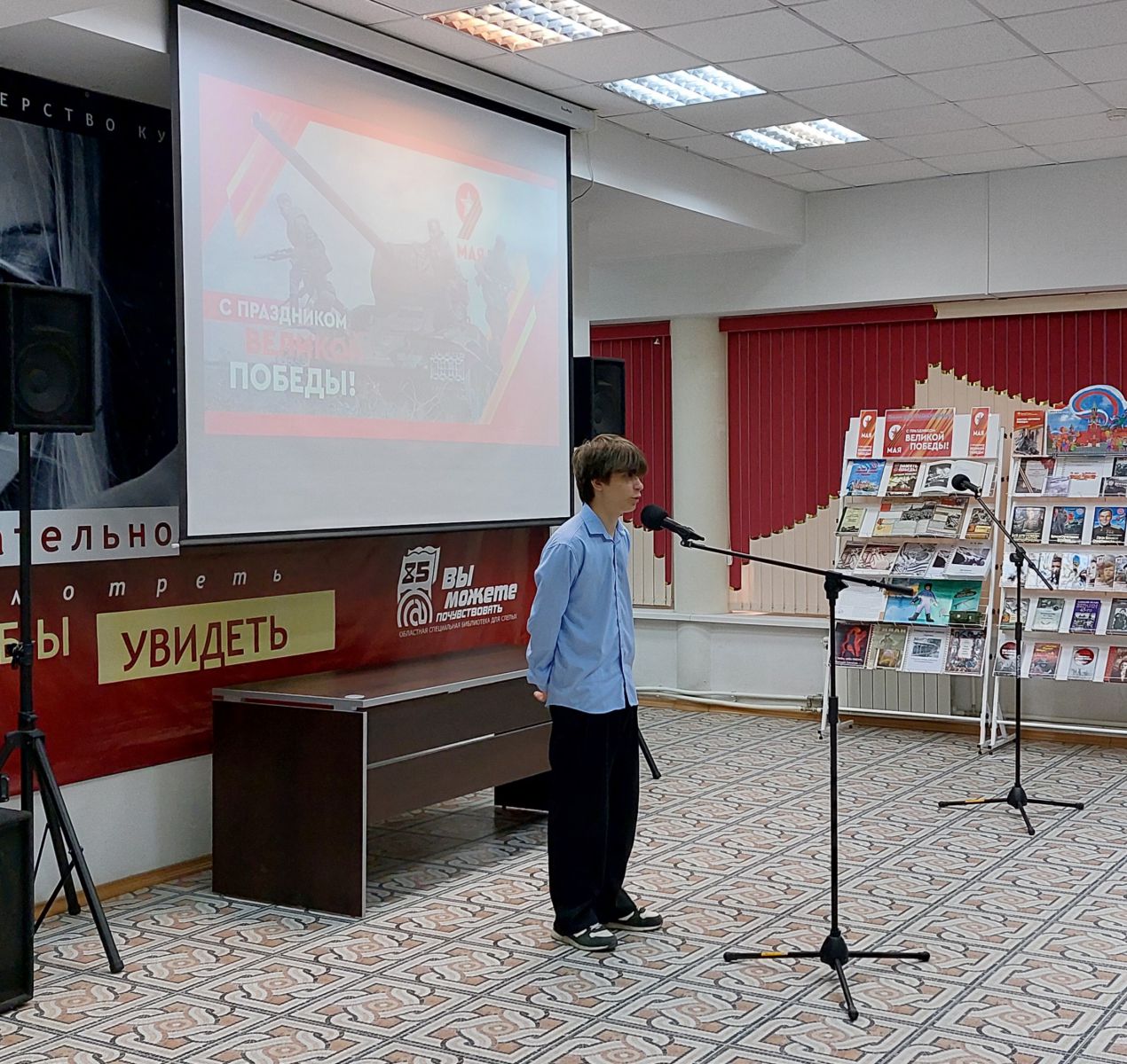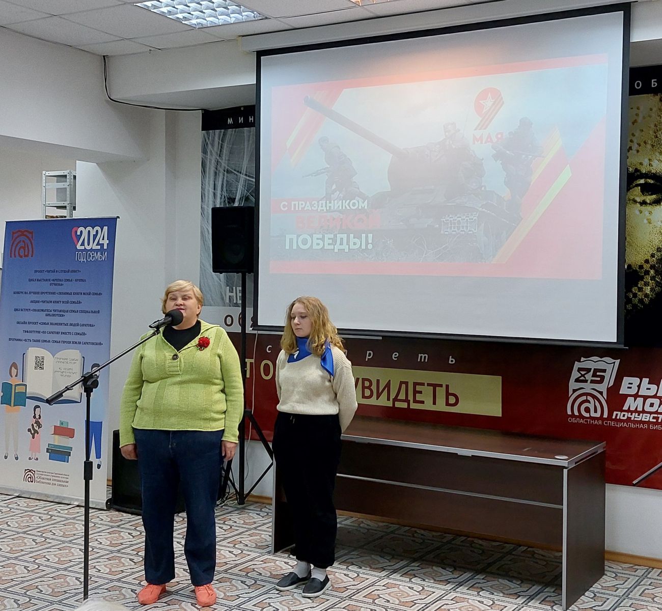 В этот предпраздничный день в нашей библиотеке в течение всего дня проходит акция «Читаем стихи о войне». Торжественно открыли акцию учащиеся Детско-юношеского центра Фрунзенского района г. Саратова. Каждого участника награждали аплодисментами. Свои любимые стихи о Великой Отечественной войне прочитали наши особые читатели. Много волнительных выступлений прозвучало в рамках акции.