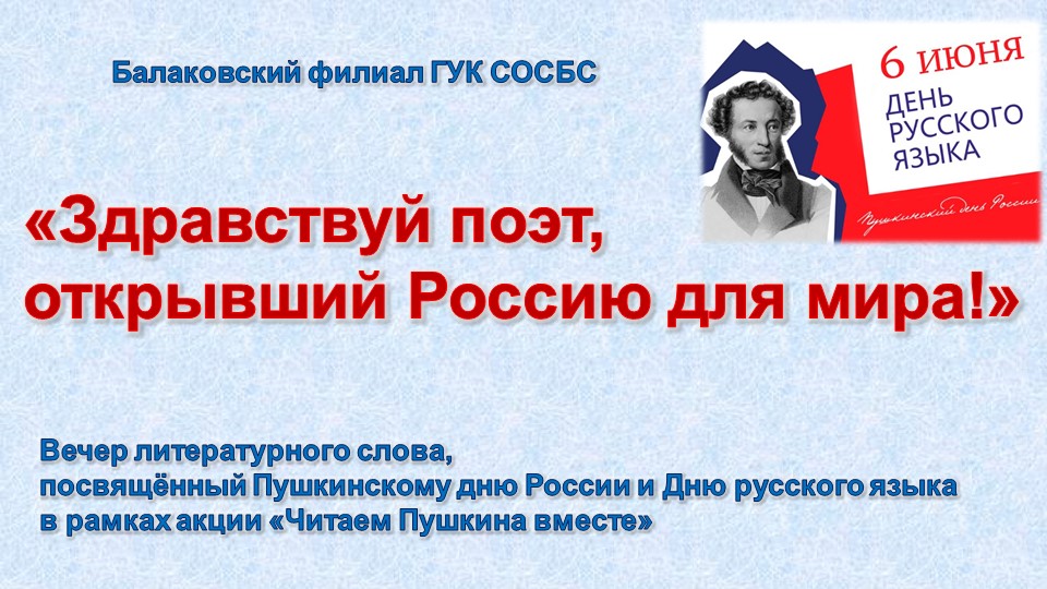 Балаковский филиал провёл для своих читателей Пушкинский день России и День русского языка - международный день, посвящённый русскому языку, отмечаемый 6 июня в день рождения великого русского поэта, драматурга и прозаика, литературного критика и теоретика литературы, историка, публициста, журналиста, редактора и издателя Александра Сергеевича Пушкина.