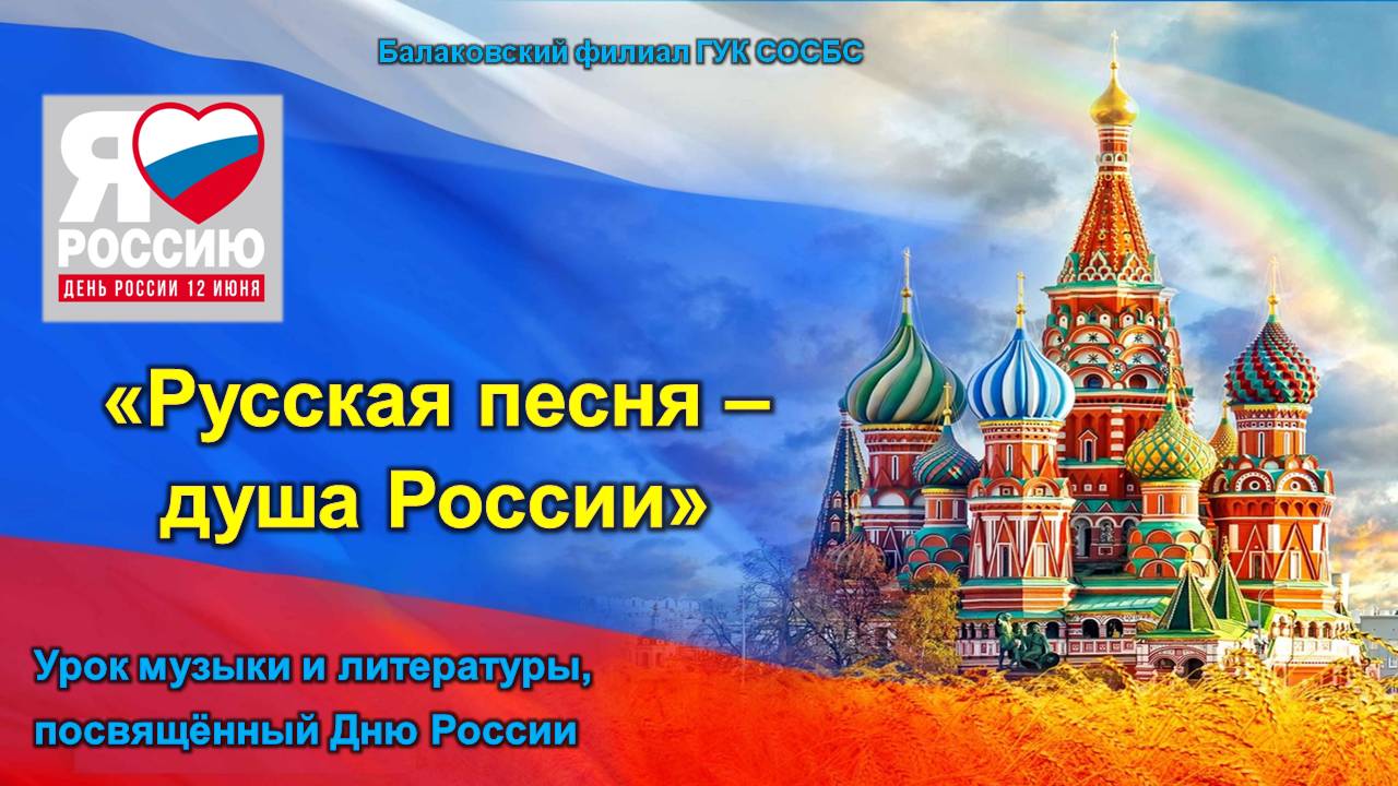Мероприятие «Русская песня – душа России» познакомило с историей возникновения праздника День России. В исполнении участников творческой студии библиотеки «Горячие сердца» и членов БМО ВОС прозвучали стихи русских и советских поэтов о России, любви к родному краю, уважении к историческому прошлому нашей страны и песни о Родине, русской земле, дружбе и любви. Балаковская поэтесса Ольга Татаркина прочитала своё стихотворение о красоте родной земле.