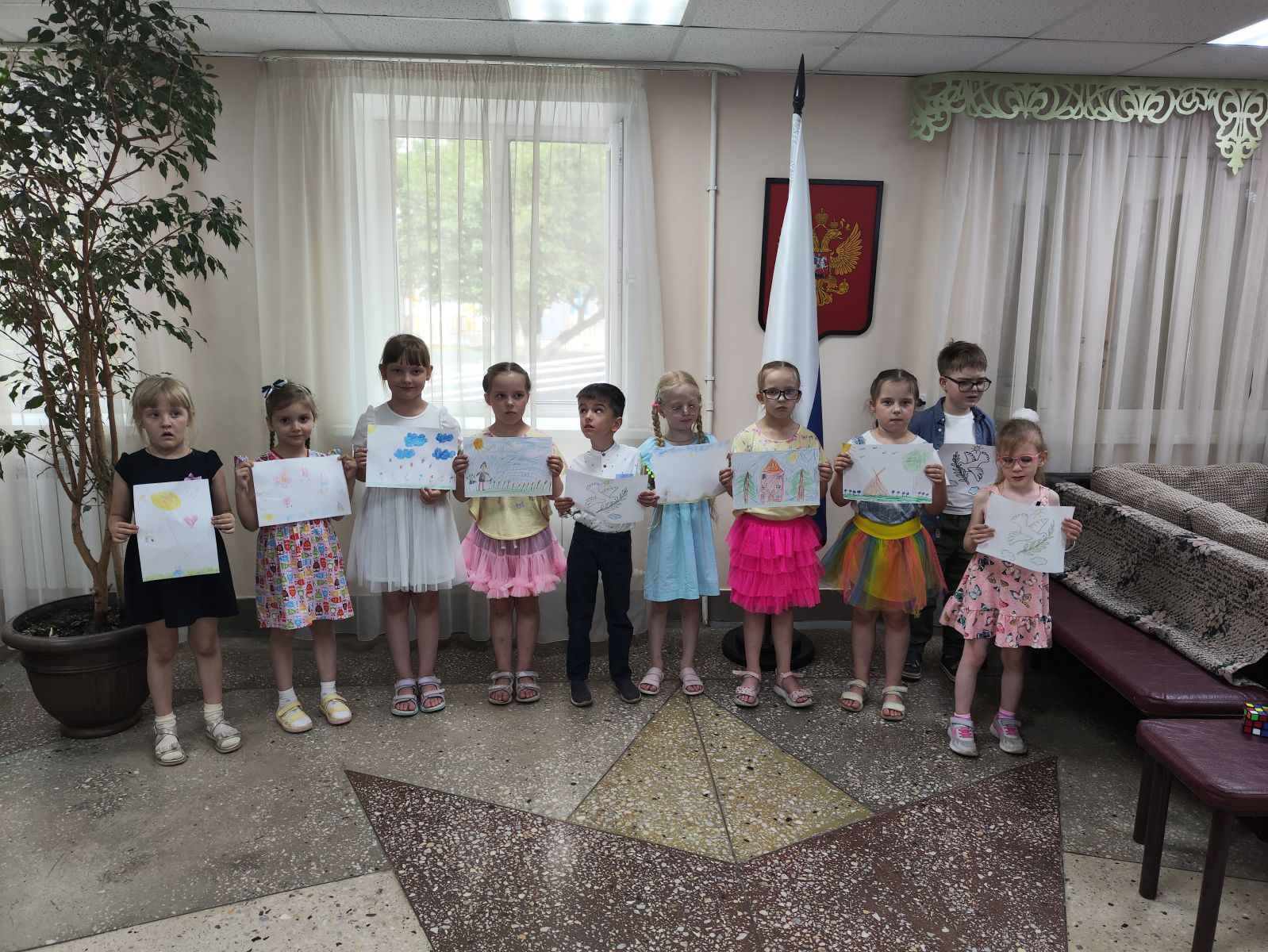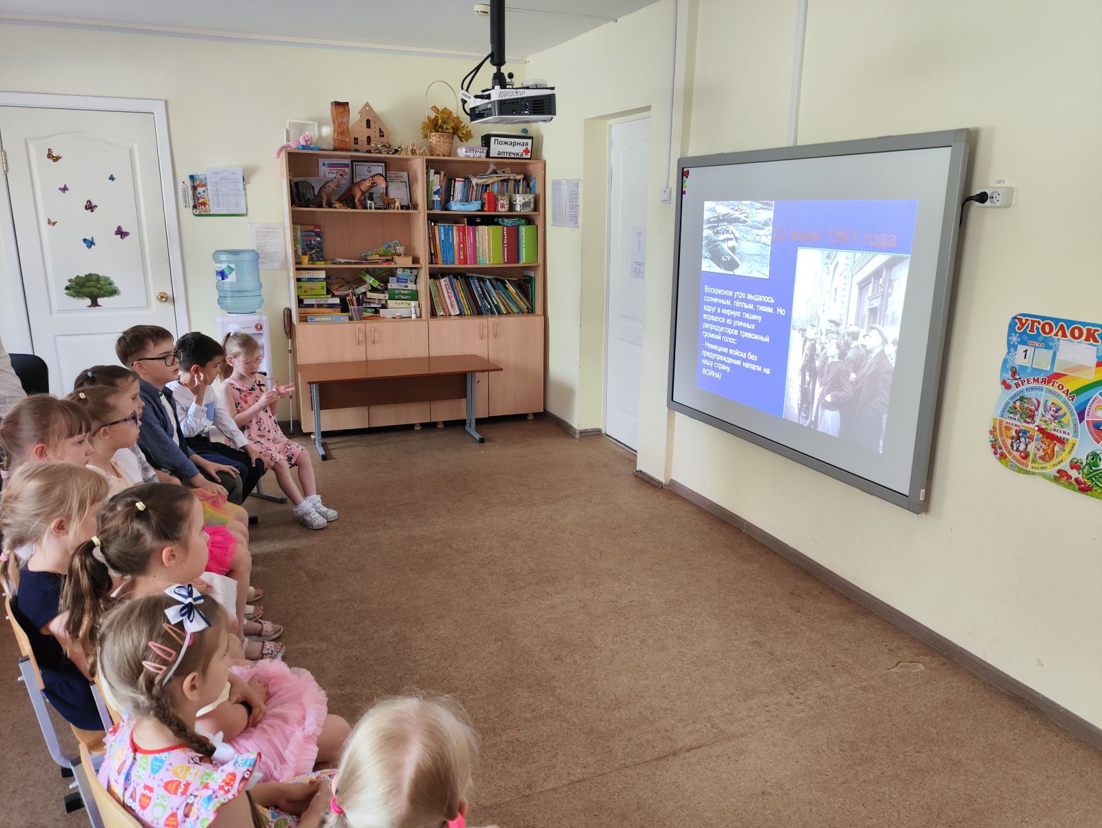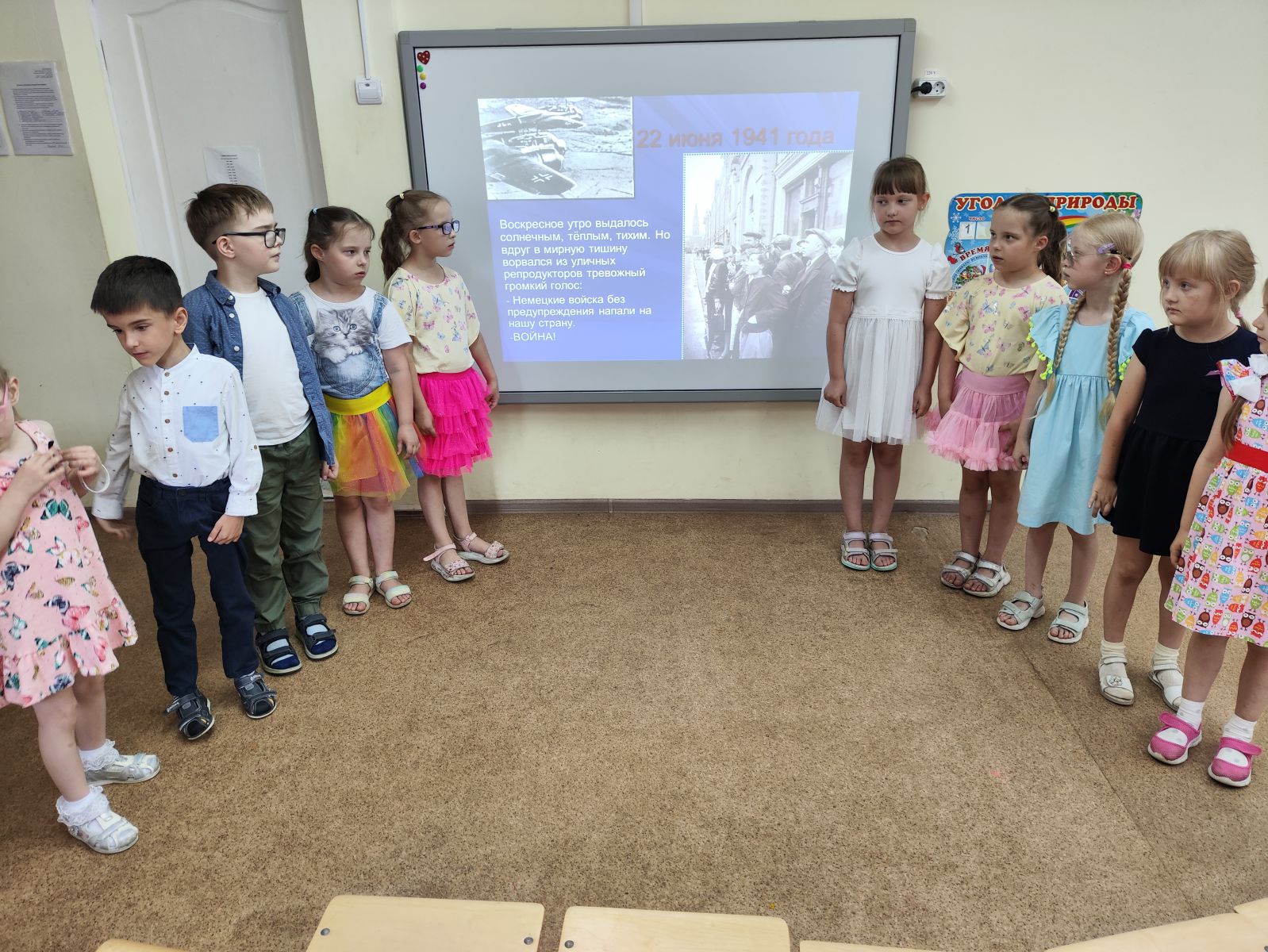 Ребятам рассказали про то, как началась война. Как было тяжело женщинам и детям, проводившим своих мужей и отцов на войну. Узнали, как солдаты отправляли письма домой и попробовали сами сложить письма-«треугольники». В конце мероприятия ребята нарисовали рисунки «Мир на Земле».