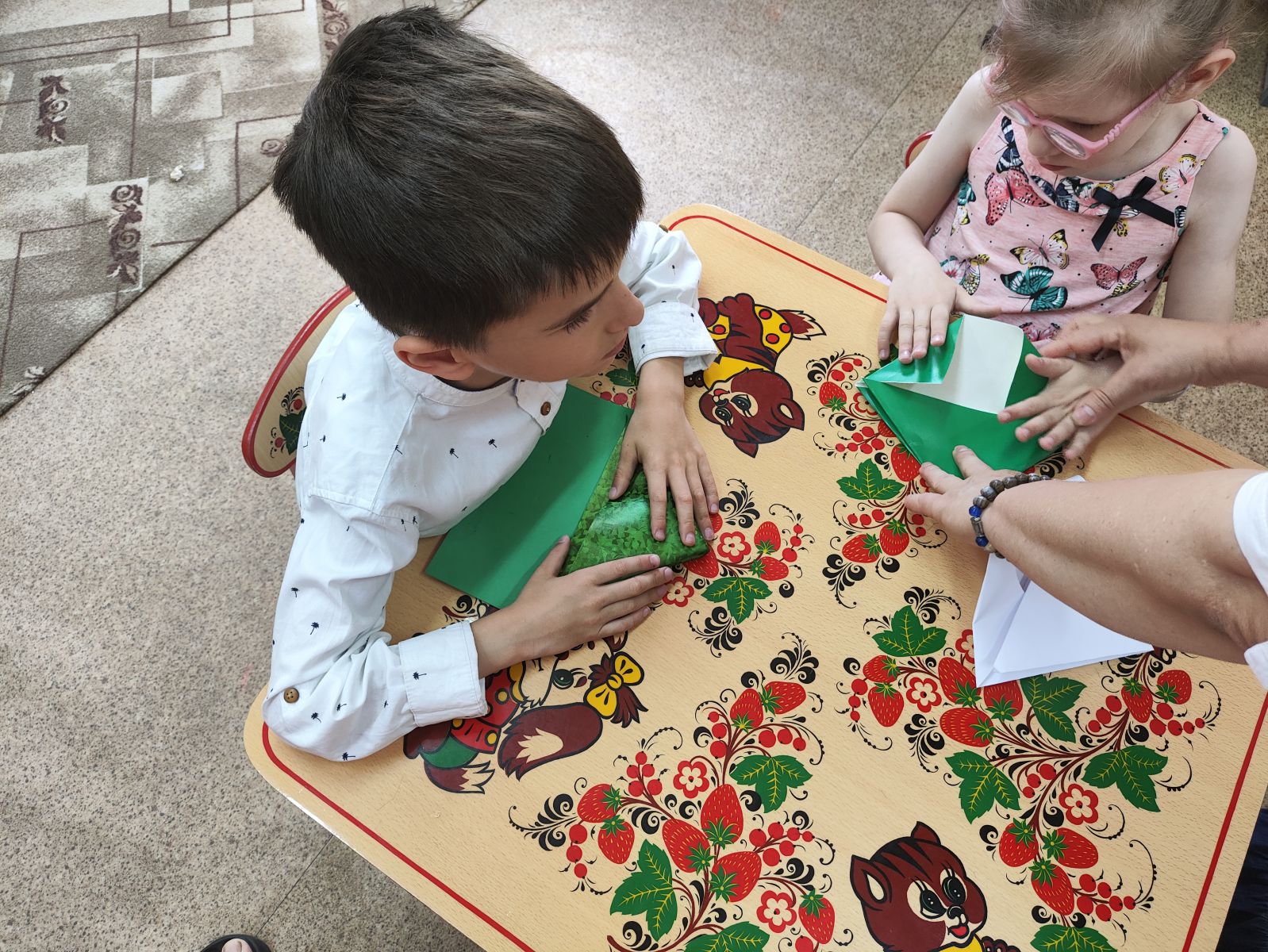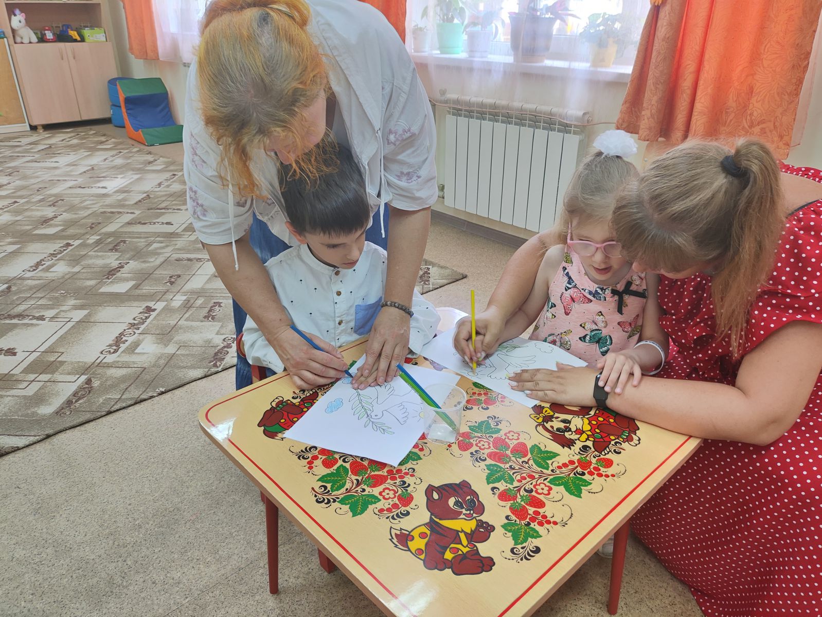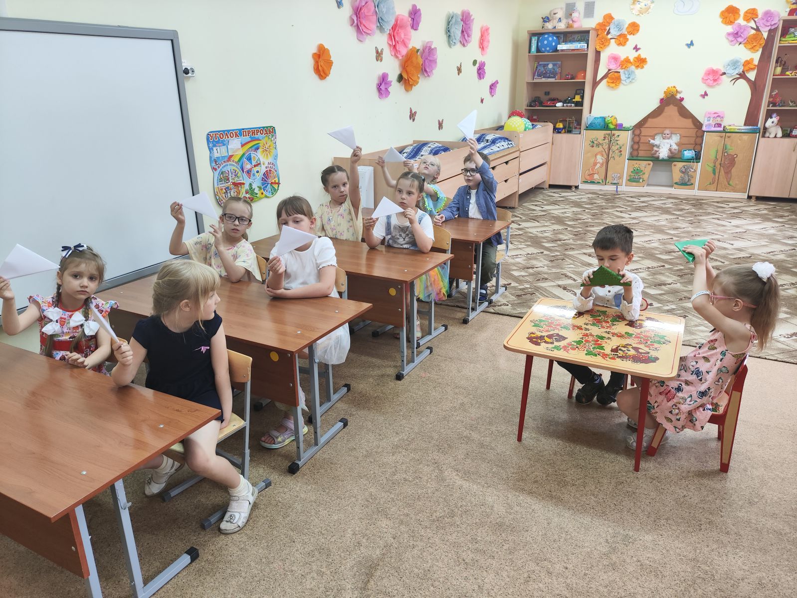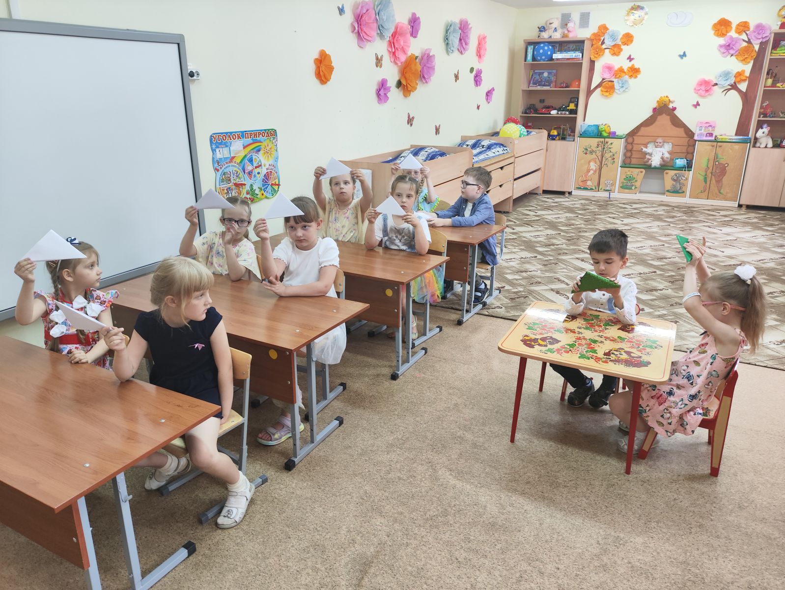 Ребятам рассказали про то, как началась война. Как было тяжело женщинам и детям, проводившим своих мужей и отцов на войну. Узнали, как солдаты отправляли письма домой и попробовали сами сложить письма-«треугольники». В конце мероприятия ребята нарисовали рисунки «Мир на Земле».