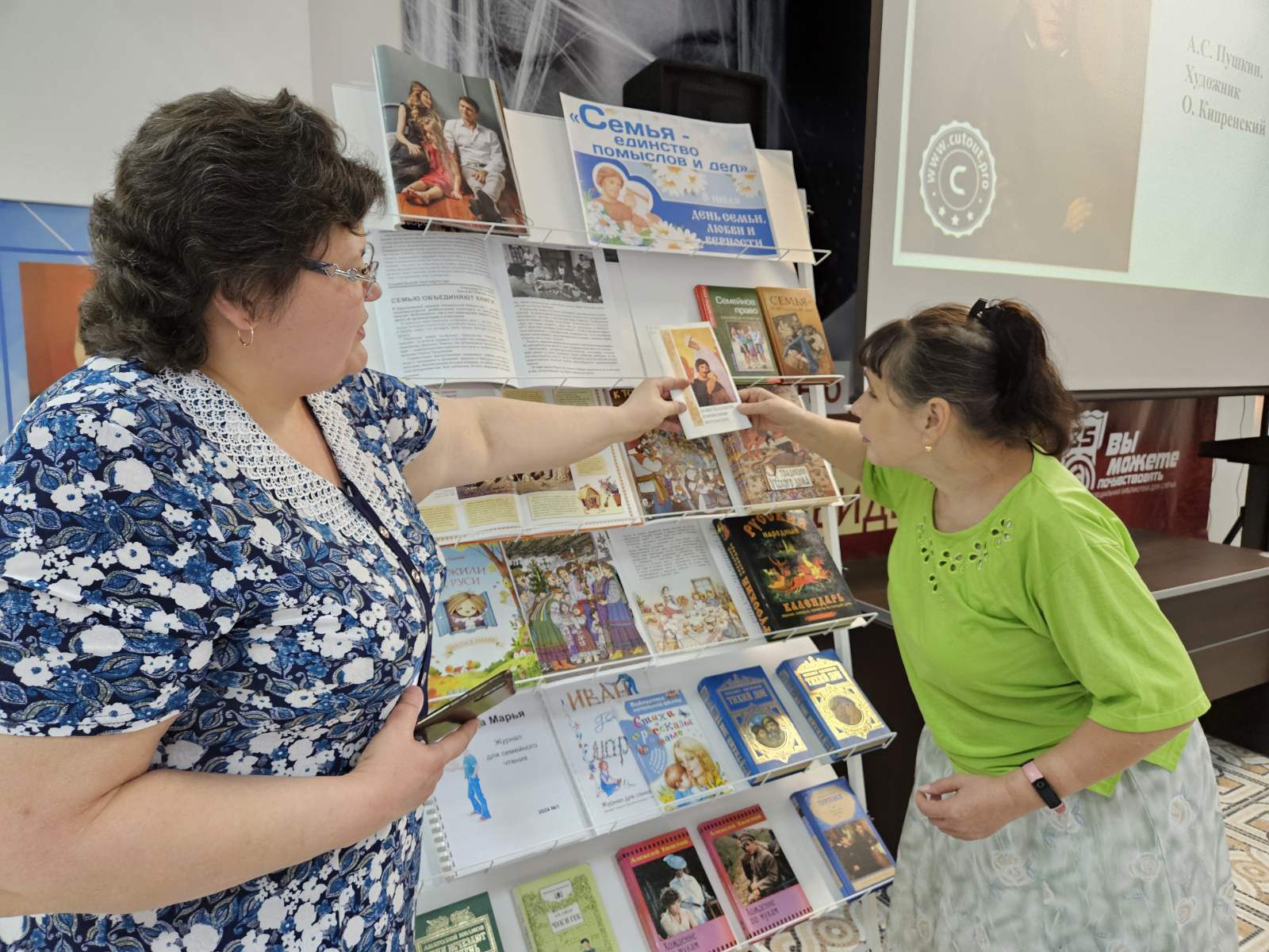 Участников праздника привлекла книжно-иллюстративная выставка «Семья на страницах литературных произведений». Книги в разных форматах, представленные на выставке, знакомили читателей с семейными традициями, ценностями, с формированием культуры родительства и воспитания детей с ОВЗ, привлечением детей к чтению. Особое внимание привлекла книга «Повесть о Петре и Февронии Муромских» инока Ермолая-Еразма. Часть выставки посвящена современной семье.
