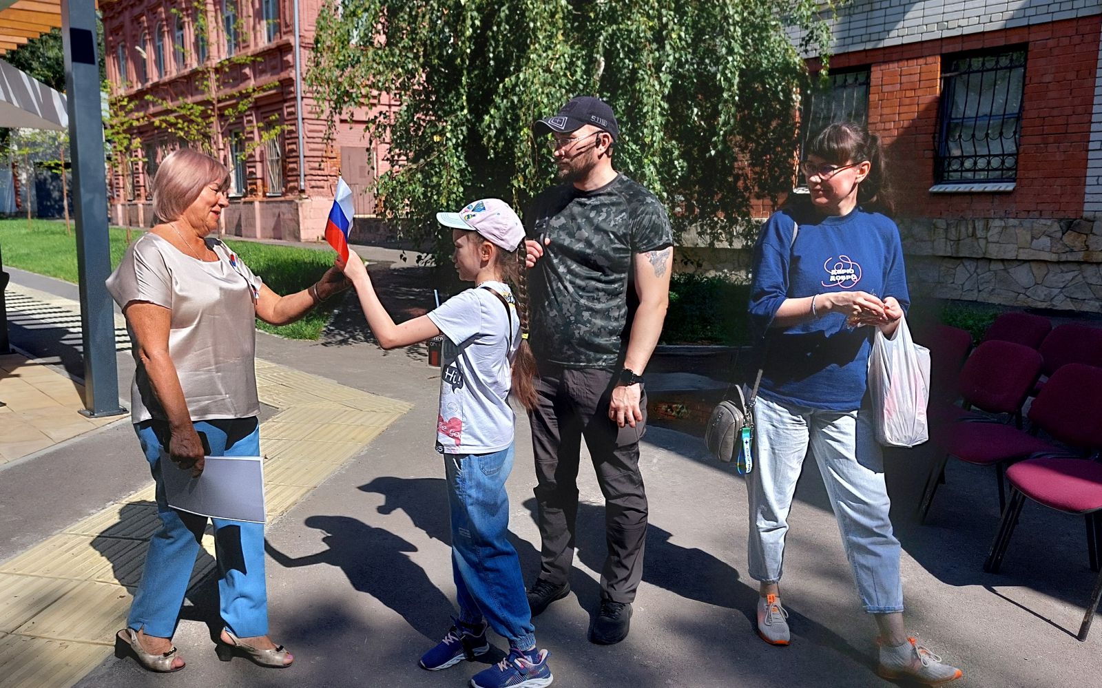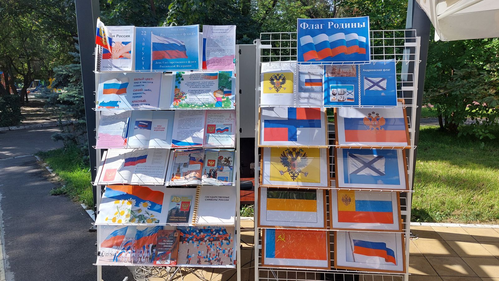 Сегодня в Летнем читальном зале ГУК Областная специальная библиотека для слепых прошел патриотический час, посвященный Дню Государственного флага РФ. Участники мероприятия ‑ не только читатели библиотеки, но и посетители парка ‑ совершили увлекательное историческое путешествие по выставке книг в плоскопечатных и специальных форматах «Во славу Российского флага» и узнали, как появились и менялись в течение многих веков символы нашей Родины. Мероприятие открыла директор Ольга Новикова и поздравила всех с днем Флага Родины и отметила, что это день гордости и уважения к своей Родине. Пусть наши сердца будут наполнены любовью к Родине и надеждой на светлое будущее. Сотрудник библиотеки, открывая книжную выставку, рассказала, что история этого символа в культурной и государственной жизни нашей страны ‑ яркая и насыщенная и берет начало в 17 веке. Участники мероприятия узнали, что символизирует триколор сегодня, состоящий из белого, синего и красного цветов, а также познакомились с историей официальной государственной символики России ‑ не только флага, но и герба и гимна. На День Государственного флага Российской Федерации пришли целыми семьями и получили в подарок бело-сине-красный флаг.