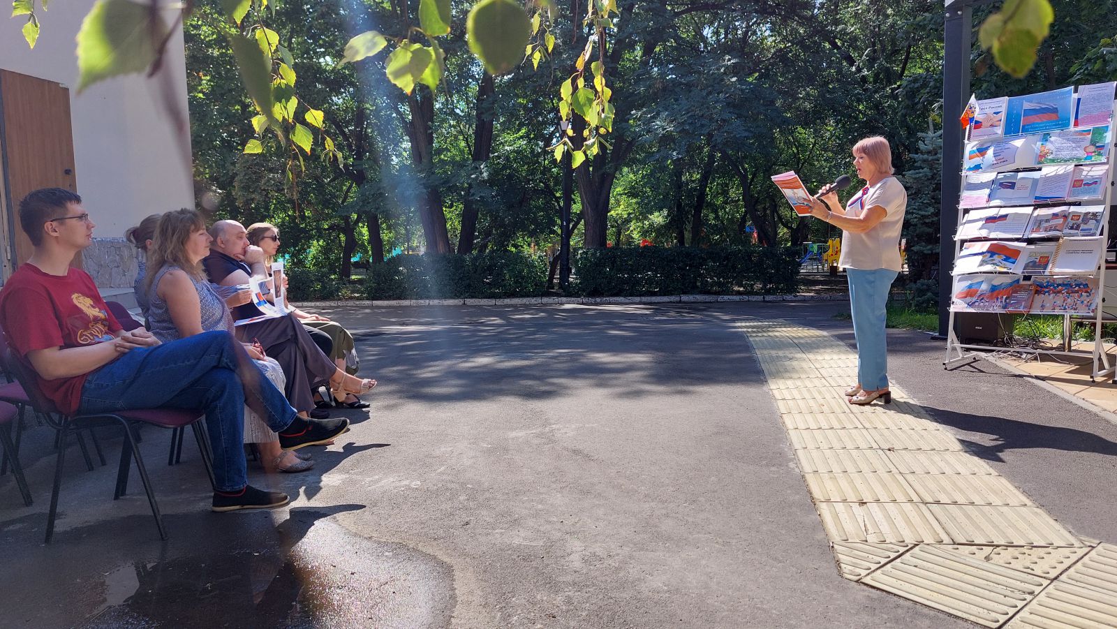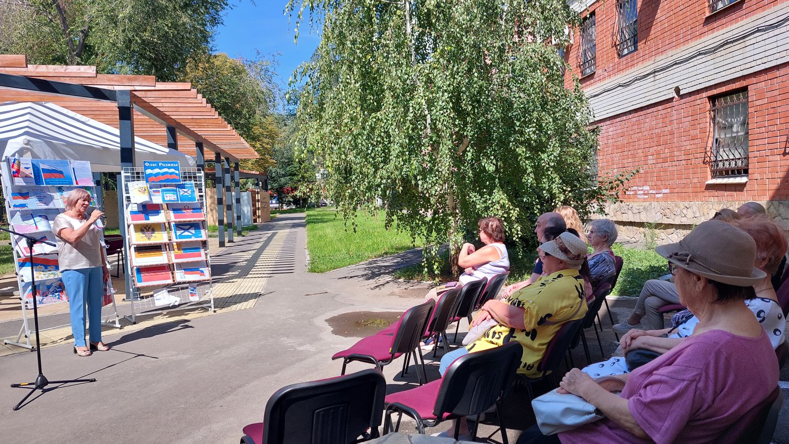 Флаг ‑ это священный символ, который объединяет нас всех, и сегодня культурно-просветительское мероприятие продолжилось акцией в поддержку жителям Курской области. В эти нелегкие для всех нас дни, вместе с Курской областной специальной библиотекой для слепых и слабовидящих им. В. С. Алехина читали стихи незрячего читателя библиотеки, коренного жителя Суджи Алексея Дутова, который прожил короткую, но яркую жизнь, успел написать 6000 стихов и издать 24 книги. Одна из них так и называется «Суджа», и стихотворение с таким названием сегодня не раз звучало. В течении дня работал открытый микрофон и звучали патриотические песни, стихотворения. Летний читальный зал был украшен символикой нашей страны.
