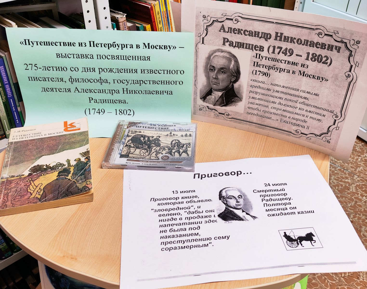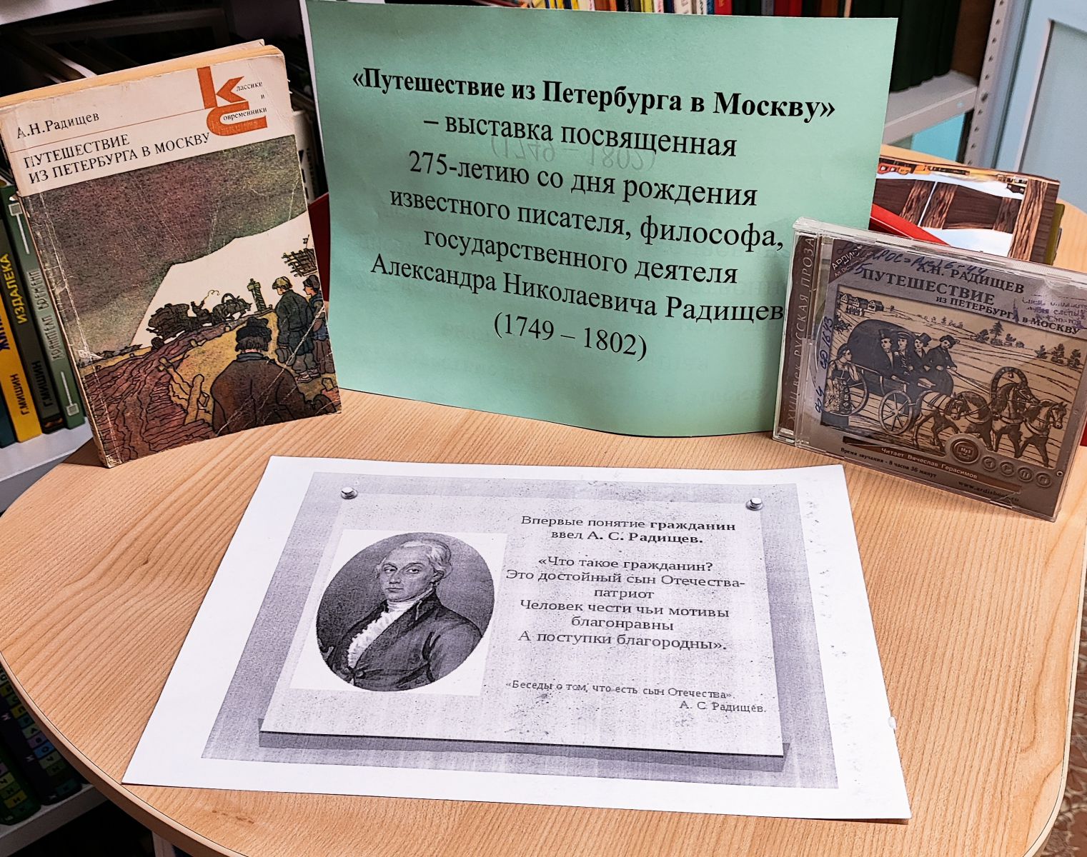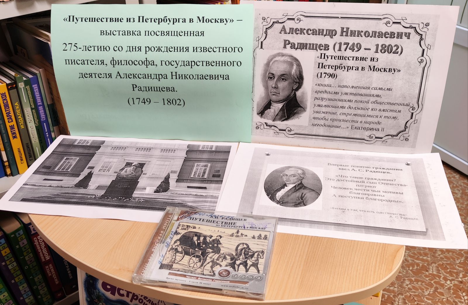С 29.08.2024 по 09.09.2024 год в детском филиале ГУК СОСБС проходит книжная выставка «Путешествие из Петербурга в Москву» – посвященная 275-летию со дня рождения известного писателя, философа, государственного деятеля Александра Николаевича Радищева. (1749 – 1802)