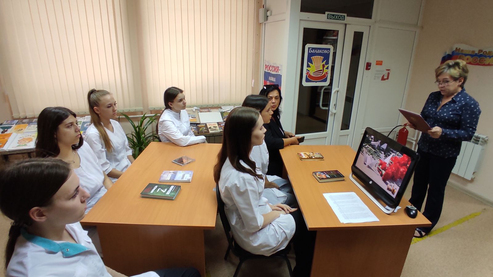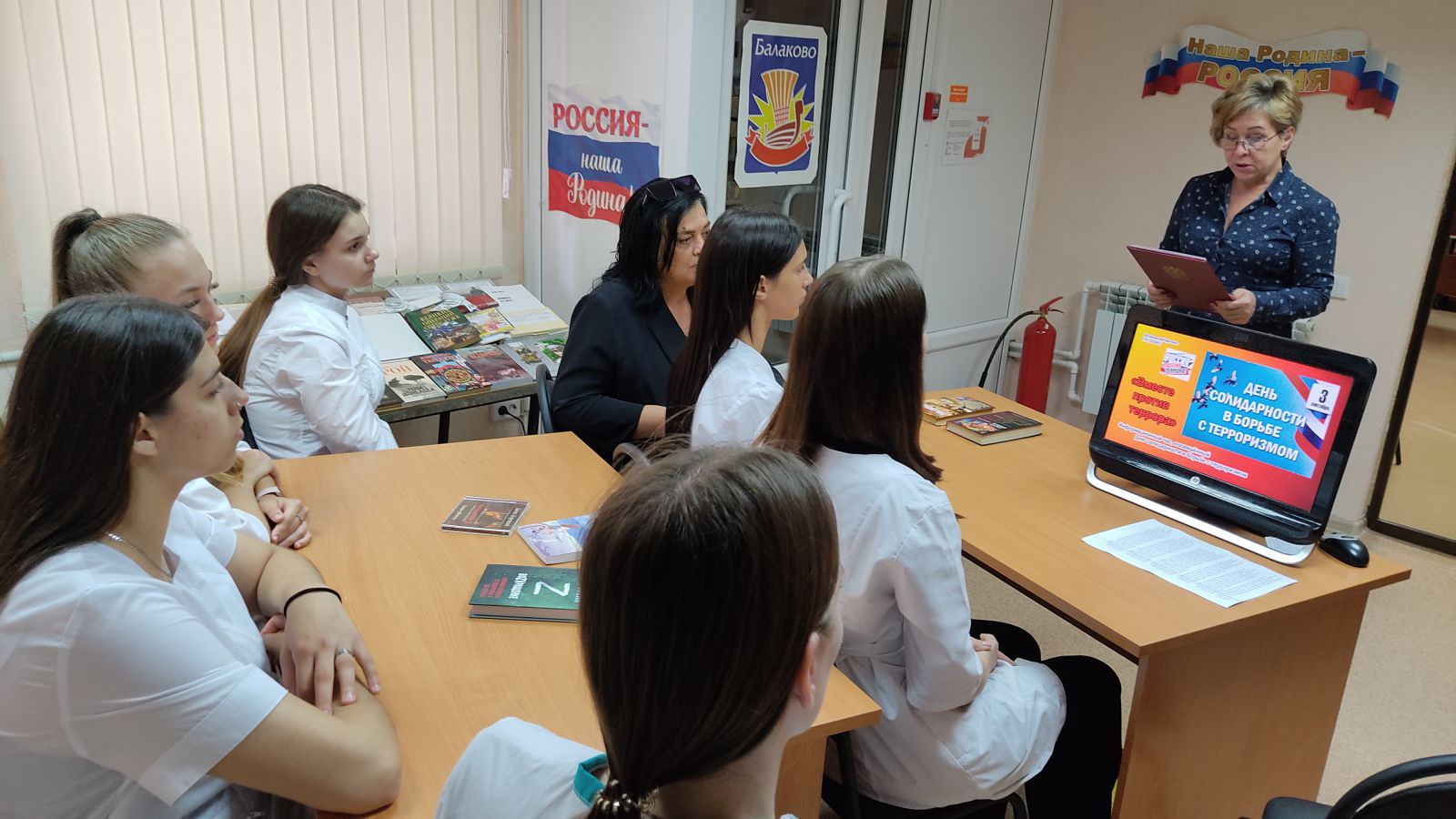 Балаковский филиал подготовил информационный час, посвящённый Дню солидарности в борьбе с терроризмом, для студентов Балаковского медицинского колледжа. Мероприятие «Вместе против террора» рассказало о памятной дате в России - 3 сентября, о террористических актах, уносящих огромное количество человеческих жизней, об активизации антитеррористического движения в мире, о необходимости повышения уровня знаний для решительного противостояния террору, а также о Почётном гражданине города Балаково Вячеславе Малярове (офицере спецподразделения группы «Альфа»), героически погибшем при освобождении заложников во время теракта в Беслане.
