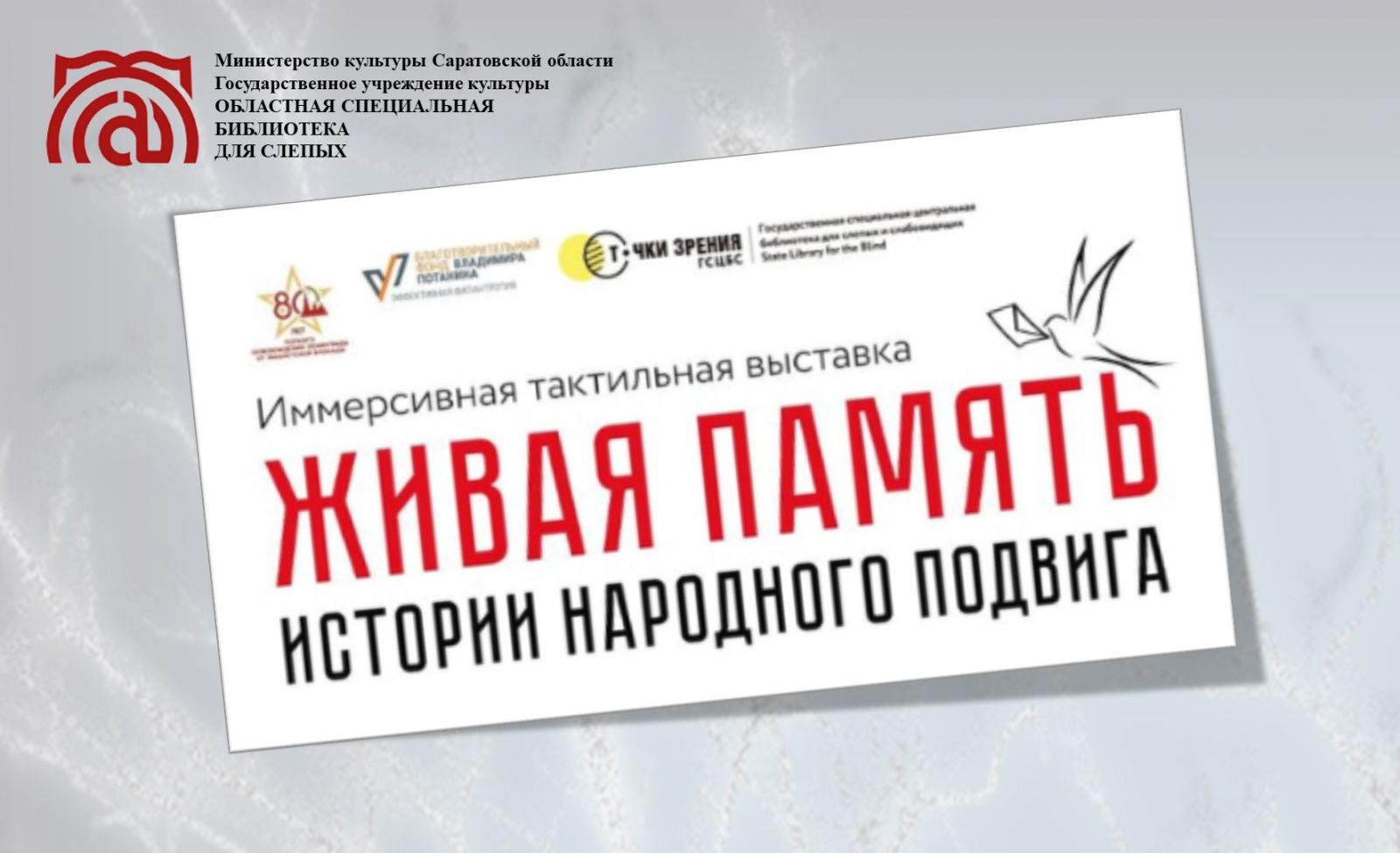 Государственное учреждение культуры «Областная специальная библиотека для слепых» приглашает на экскурсии по иммерсивной тактильной выставке «Живая память: истории народного подвига». Выставка посвящена 80-летию со Дня полного освобождения Ленинграда от фашистской блокады.