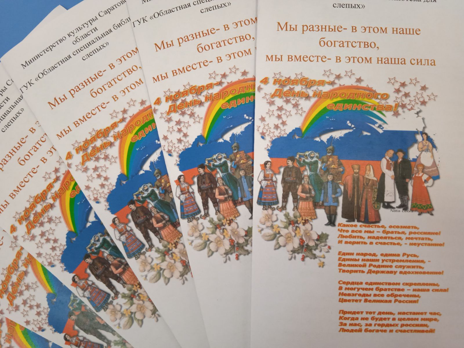 Сотрудники ГУК «Областная специальная библиотека для слепых» на 1-й Садовой, 4 провели акцию «Мы разные – в этом наше богатство, мы вместе – в этом наша сила» ко Дню народного единства. В рамках акции были подготовлены буклеты об истории праздника, основные вехи исторических событий, с которыми связан День народного единства.