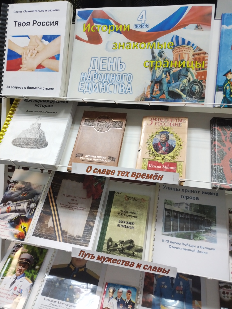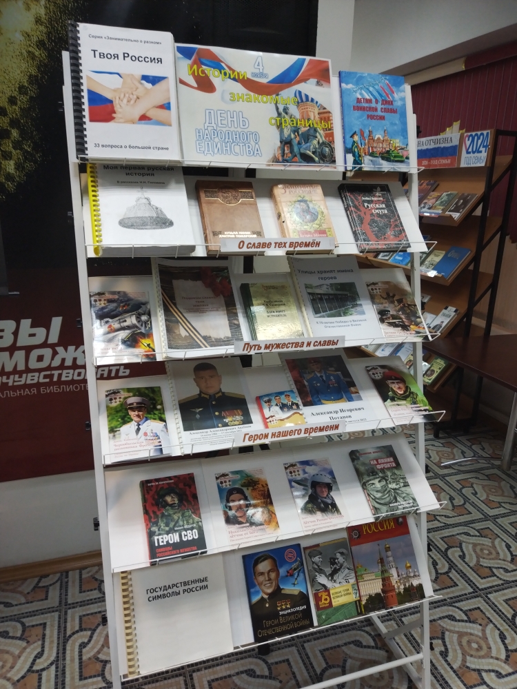 4 ноября вся Россия будет отмечать праздник – День народного единства. Несмотря на то, что это относительно молодой праздник, его корни уходят в 17 век. В преддверии Дня народного единства в Областной специальной библиотеке для слепых в Детском парке оформлена выставка, посвящённая этому празднику. На выставке представлены книги об истории России и русского народа, о героях и событиях Смутного времени, прославленных русских полководцах и многом другом. Читатели смогут подробнее узнать о тяжёлом для России времени, вспомнить, что все россияне, пусть и принадлежащие к разным социальным группам, национальностям, вероисповеданиям – единый народ с общей исторической судьбой и общим будущим. Представленные книги рассказывают о героях Отечества, начиная с Александра Невского, Минина и Пожарского, Суворова, до героев 1812 года, героев Великой Отечественной войны 1941-1945 гг. и героев Специальной военной операции.