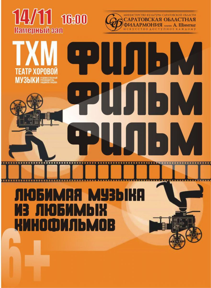 Саратовская областная филармония имени Альфреда Шнитке приглашает на концерт Театра хоровой музыки «Фильм. Фильм. Фильм», в котором прозвучат популярные песни из любимых кинофильмов: «О бедном гусаре замолвите слово», «Земля Санникова», «Три тополя на Плющихе», «Весёлые ребята», «Цирк», «Синяя птица», «Волга-Волга», «Кубанские казаки», «Дело было в Пенькове», «Гусарская баллада». Хорошо знакомые мелодии зазвучат по-новому в исполнении ведущего хорового коллектива России.