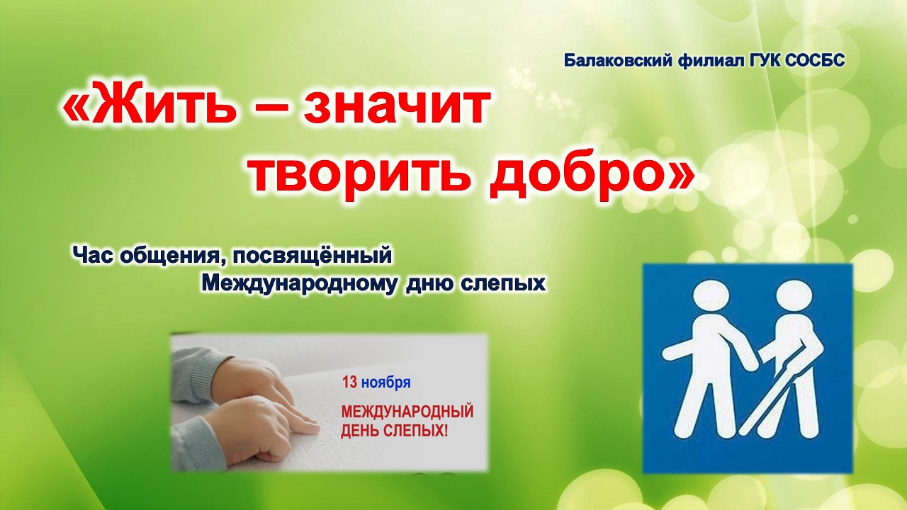Балаковский филиал Областной специальной библиотеки для слепых провёл час общения для членов Балаковской местной организации Всероссийского общества слепых и читателей библиотеки, посвящённый Международному дню слепых. Мероприятие «Жить – значит творить добро» рассказало о создателях системы чтения и письма для слепых Валентине Гаюи и Луи Брайле, о жизни, досуге и проблемах инвалидов по зрению. Свободный микрофон предоставил возможность желающим показать свои таланты в разнообразных жанрах: в вокале и чтении поэтических произведений.