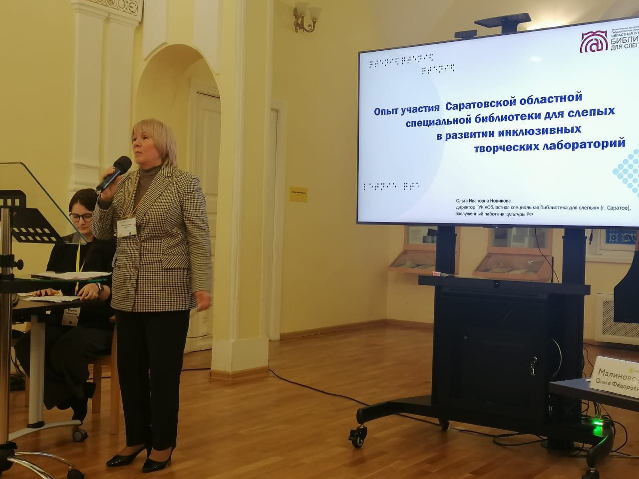 Ольга Новикова выступила с докладом «Опыт участия Саратовской областной специальной библиотеки для слепых в развитии инклюзивных творческих лабораторий» и представила инклюзивные проекты по развитию инклюзивных пространств, отметила широкое взаимодействие областных учреждений культуры Саратовской области по интеграции и реабилитации в отрасли культуры региона. Подробно представила ИТЛ на базе Государственного автономного учреждения культуры Саратовской области «Дворец культуры “Россия”». Рассказала о проекте «Театр для всех». Ольга Ивановна подробно рассказала о ежегодном областном фестивале творчества инвалидов по зрению, который проходит при поддержке министерства культуры Саратовской области. Отметила участие библиотеки в международном фестивале «Эстафета доброты».