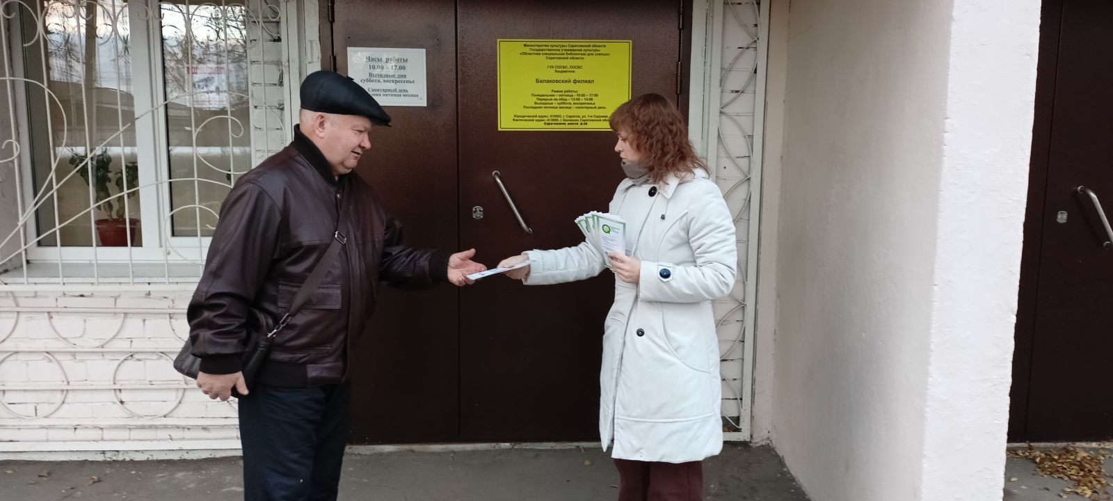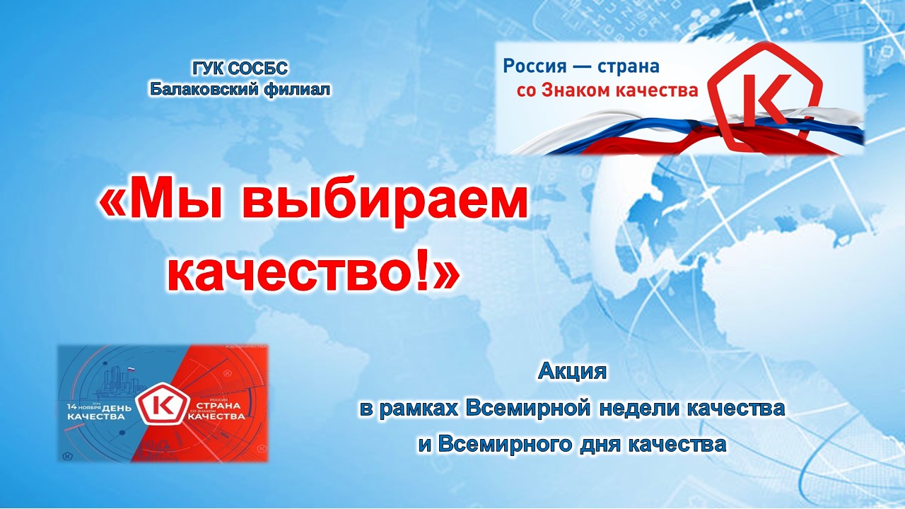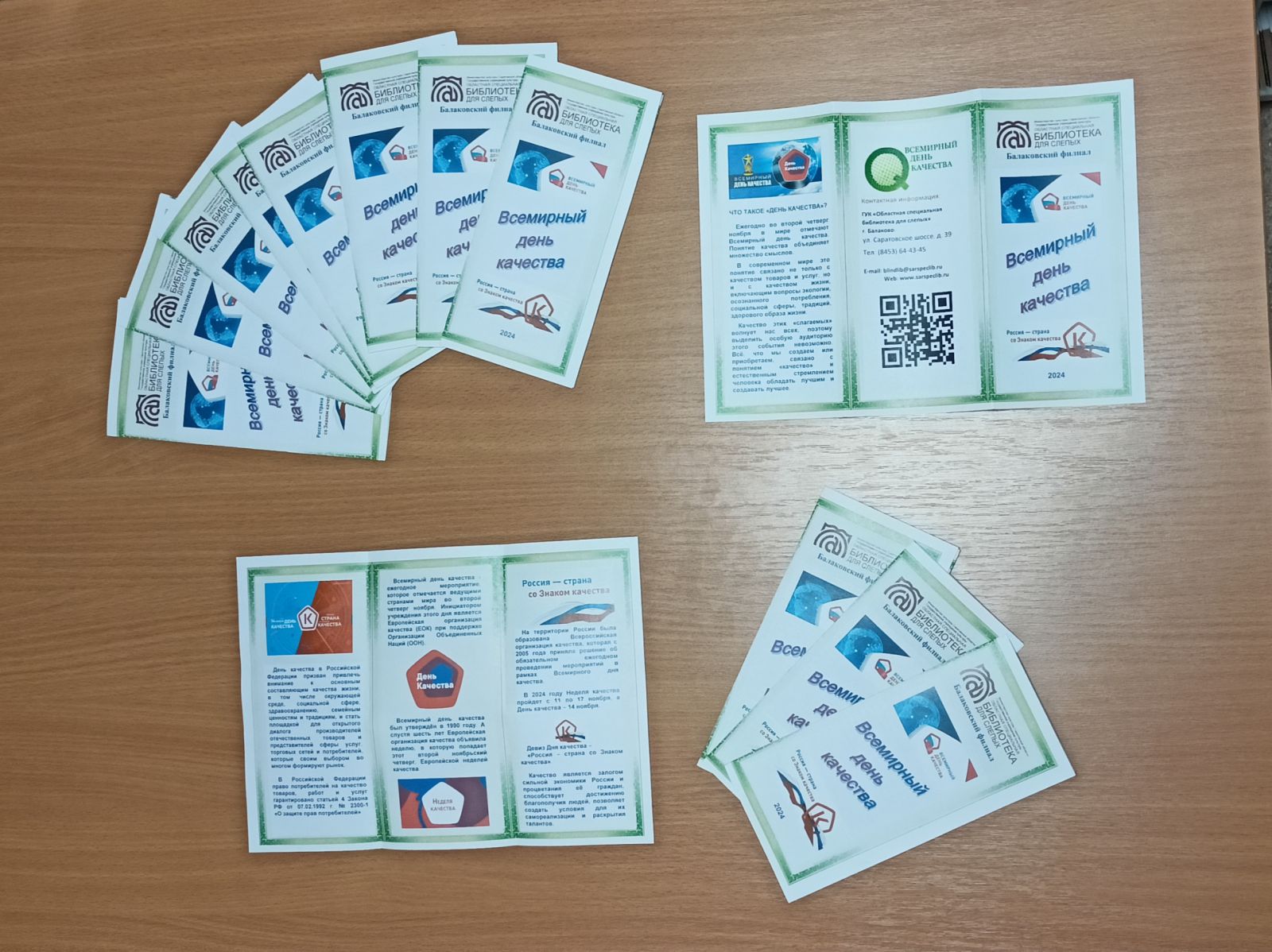 Балаковский филиал Областной специальной библиотеки для слепых провёл акцию «Мы выбираем качество!», посвящённую Неделе качества (11-17 ноября) и Дню качества (14 ноября). Сотрудники библиотеки рассказали о законах, регулирующих отношения в области защиты прав потребителей, проинформировали читателей по вопросам качества товаров и услуг на потребительском рынке; подготовили буклеты об ответственном отношении к качеству собственной жизни и социального окружения, о популяризации Российской системы качества.