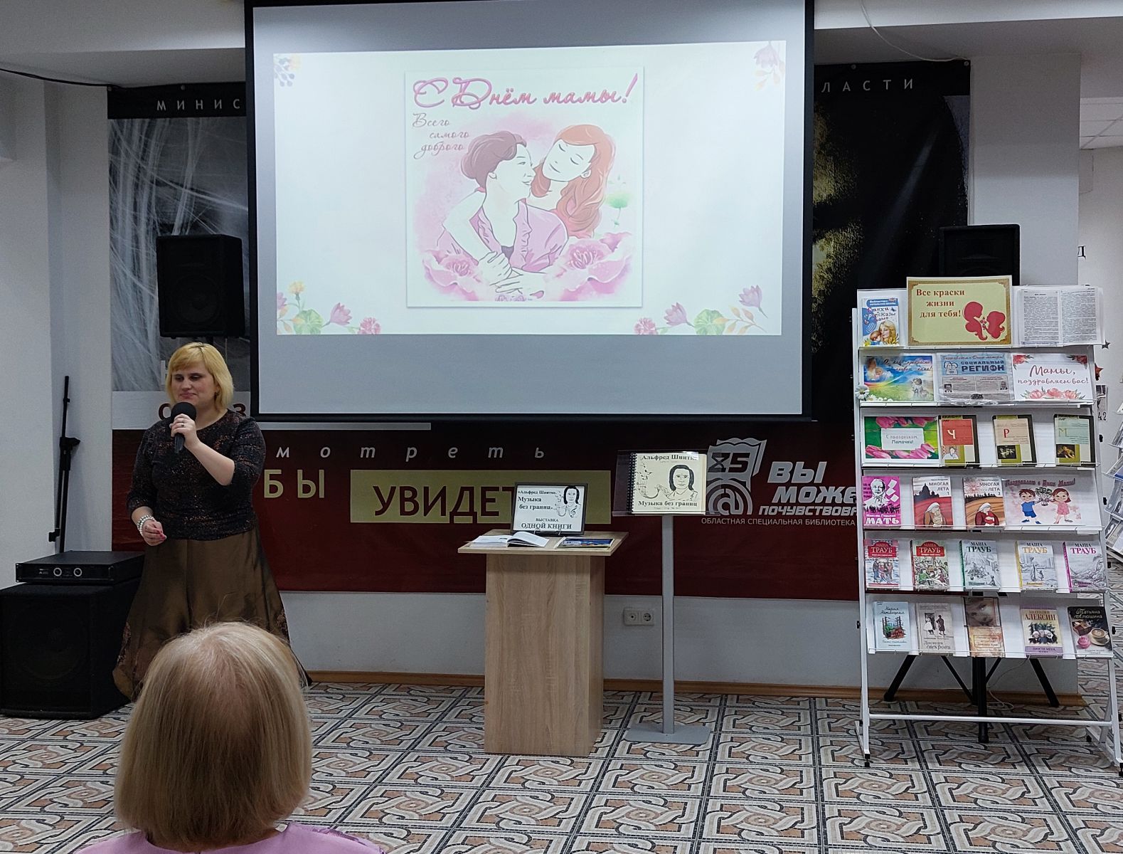 Директор ГУК «Областная специальная библиотека для слепых» Ольга Новикова тепло поздравила всех мам с наступающим праздником, особенно мам, воспитывающих детей с ОВЗ.