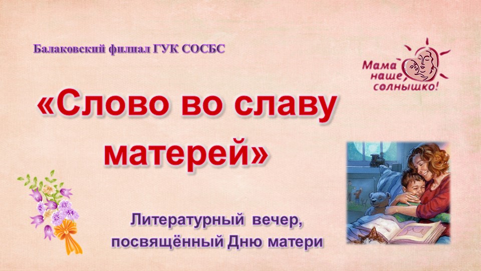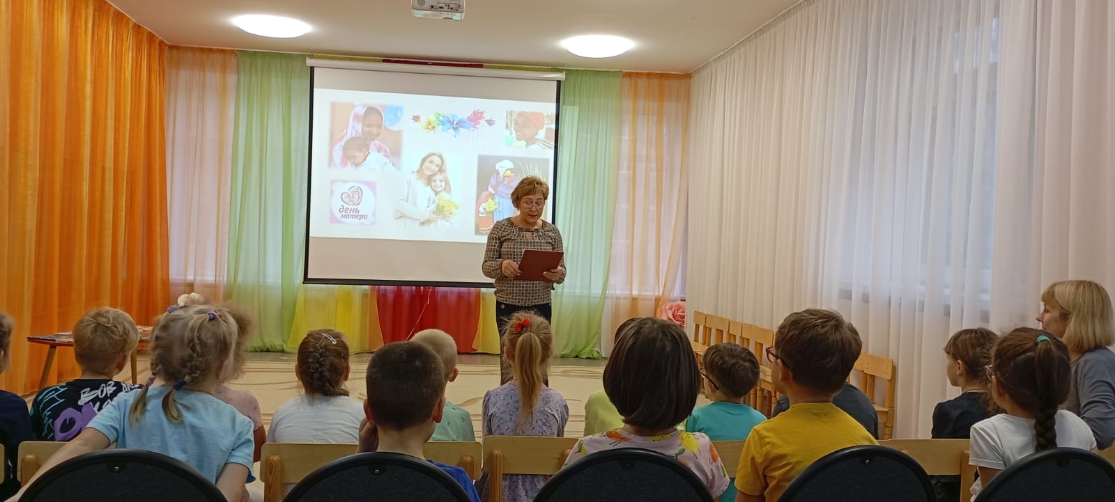 Мероприятие «Слово во славу матерей» познакомило ребят с произведениями, посвящёнными Дню матери. Дети посмотрели видео со стихотворением «Разлука» Агнии Барто и послушали аудиозаписи песен о маме. Были проведены викторины, игры, конкурс стихов.