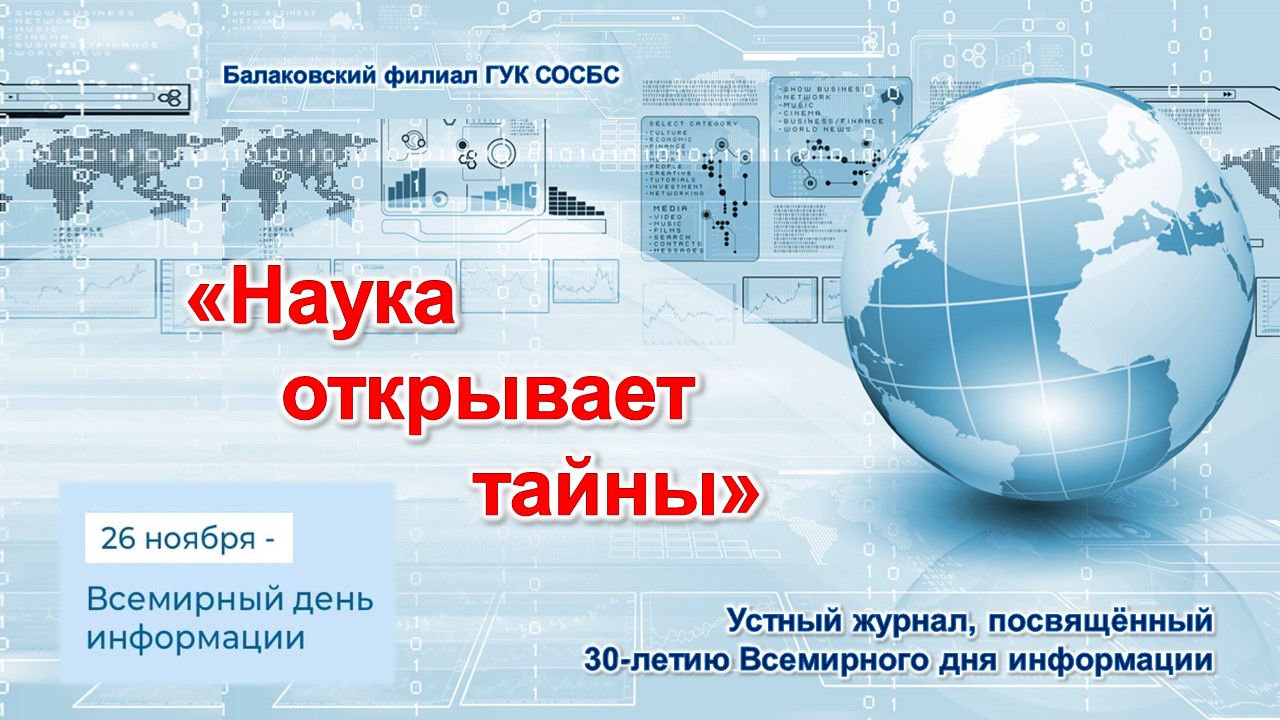 Балаковский филиал Областной специальной библиотеки для слепых подготовил для своих читателей - получателей социальных услуг КЦСОНа - устный журнал «Наука открывает тайны», посвящённый 30-летию Всемирного дня информации. Мероприятие рассказало об истории возникновения праздника, о важности информации в современном мире, о том, какая бывает информация по форме представления, о способах её восприятия, в том числе людьми с нарушениями зрения.