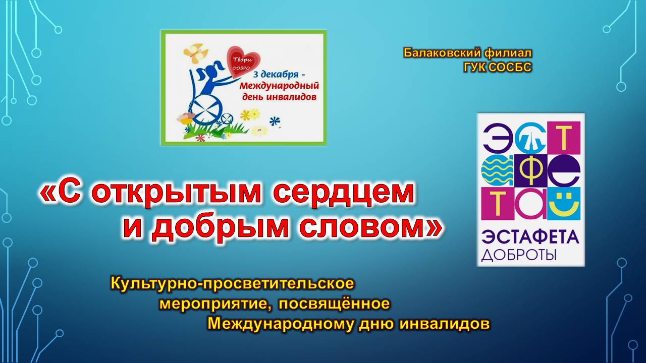 Мероприятие «С открытым сердцем и добрым словом» рассказало о возникновении даты Международного дня инвалидов, о людях, обладающих невероятной душевной силой духа и жизнелюбием, живущих активной и интересной жизнью; познакомило с литературой о жизни, проблемах и достижениях людей с нарушениями здоровья, в том числе по зрению. В ходе мероприятия обсуждалось отношение к людям с особыми потребностями, о том, как сохранить своё здоровье и окружающих. Школьники активно включились в разговор о взаимопонимании, сострадании, а также обсуждали, как и чем можно помочь людям с нарушениями здоровья.
