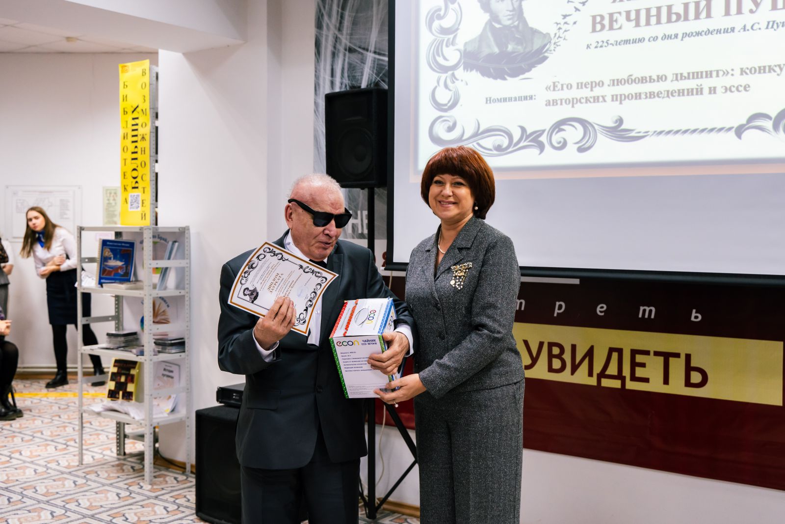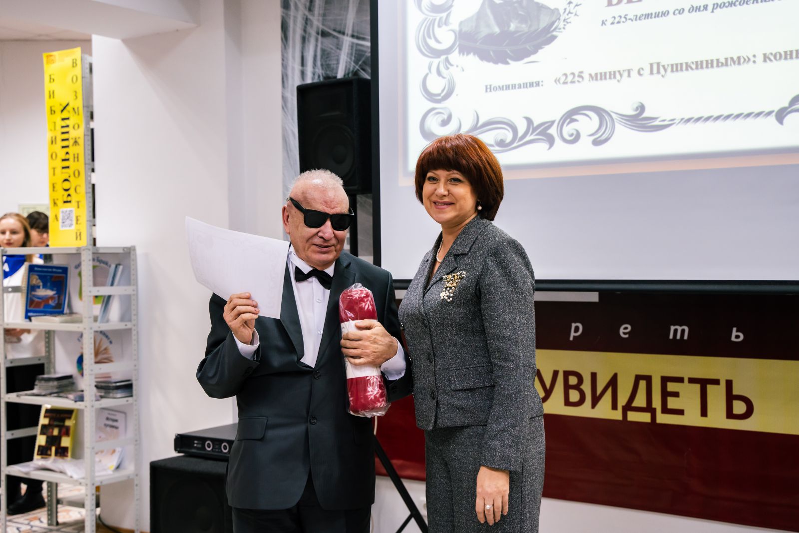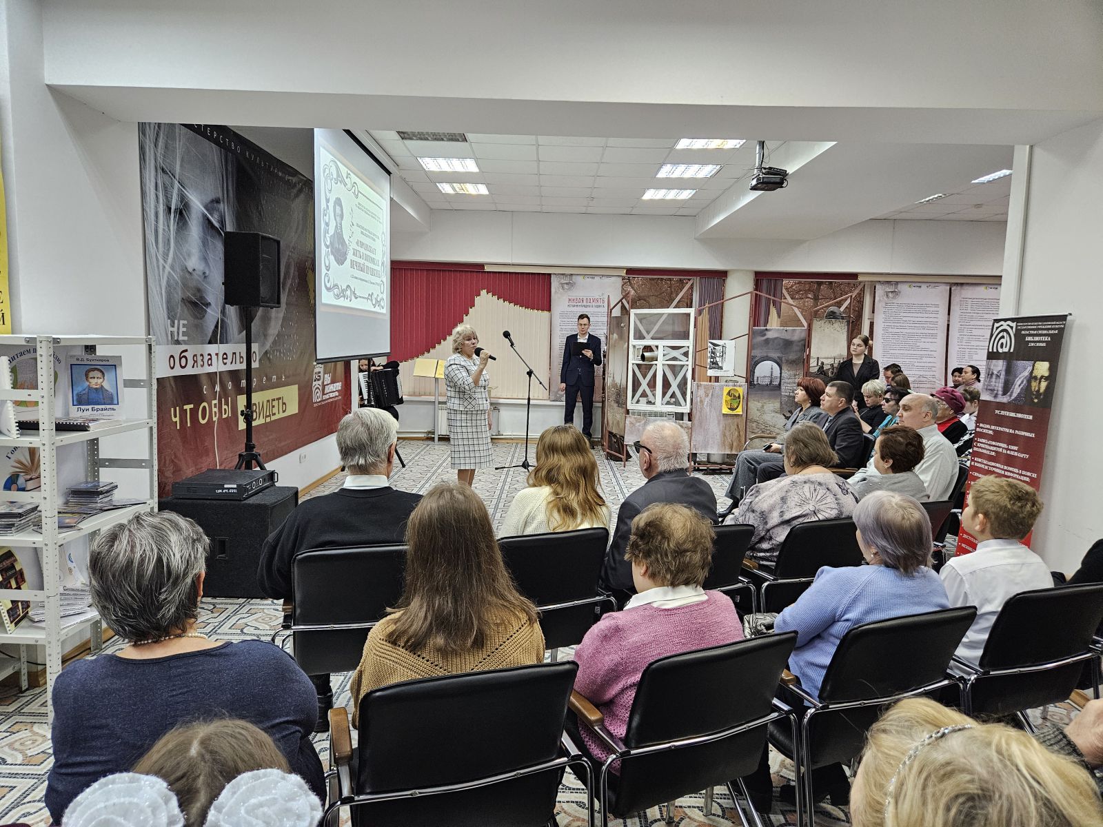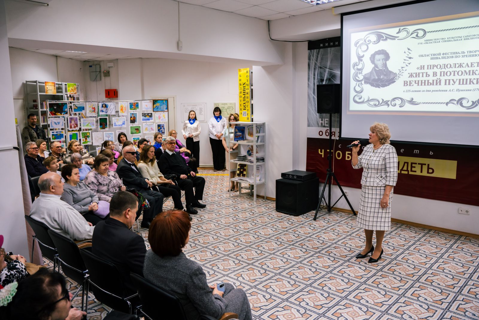 Зал библиотеки был торжественно оформлен. Была представлена книжная выставка, посвященная Международному дню инвалидов, в специальных и в плоскопечатных форматах. Гости и участники мероприятия смогли прикоснуться к творчеству людей с ограничениями по зрению на выставке рисунков «Удивительный мир Пушкина».