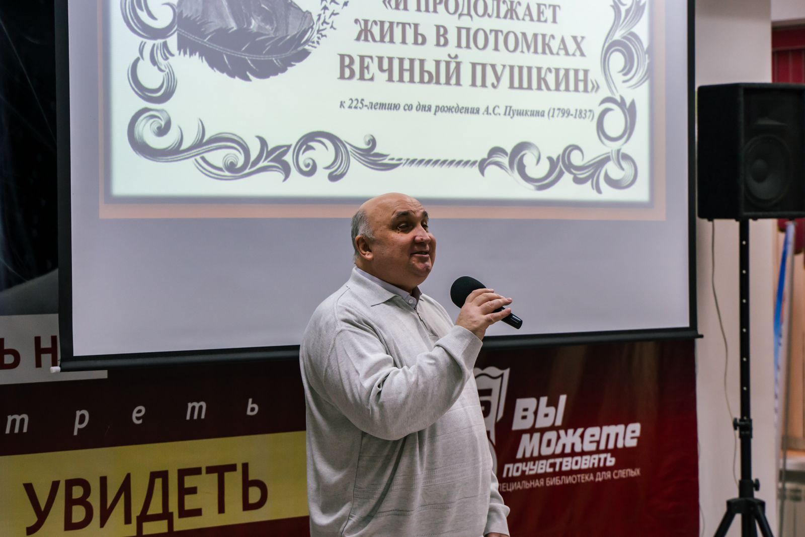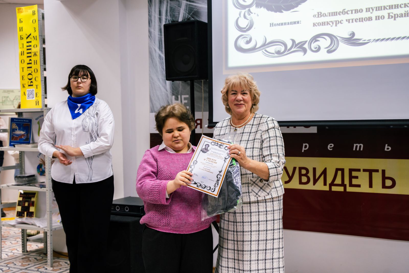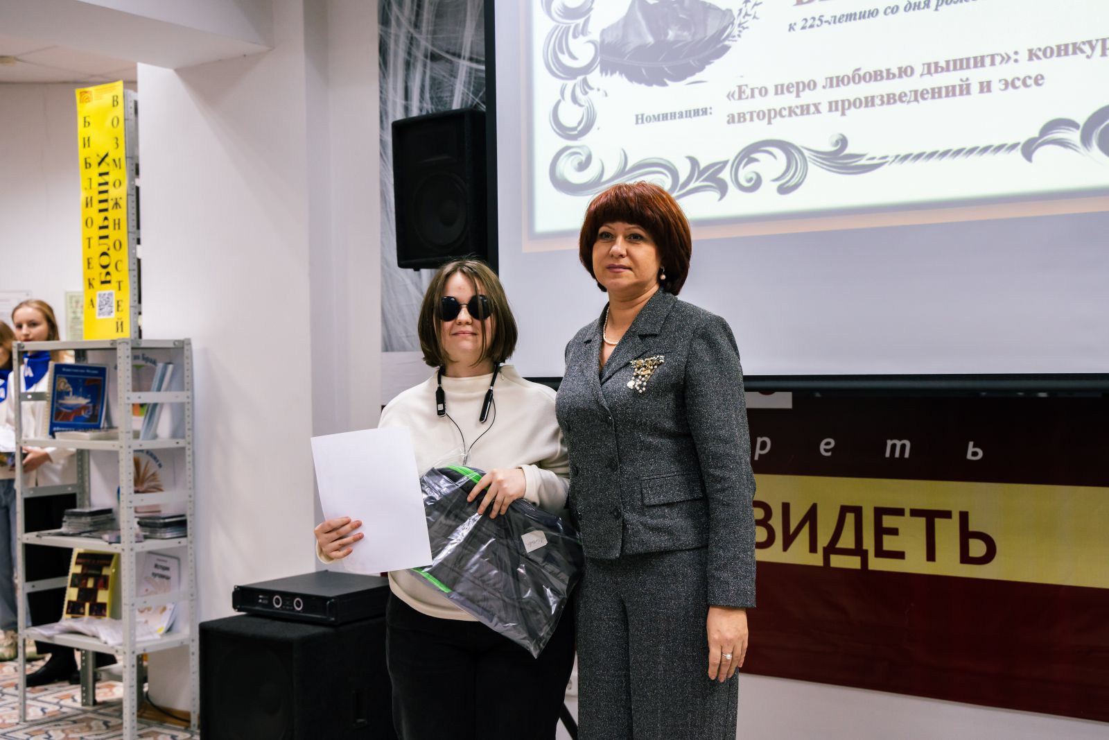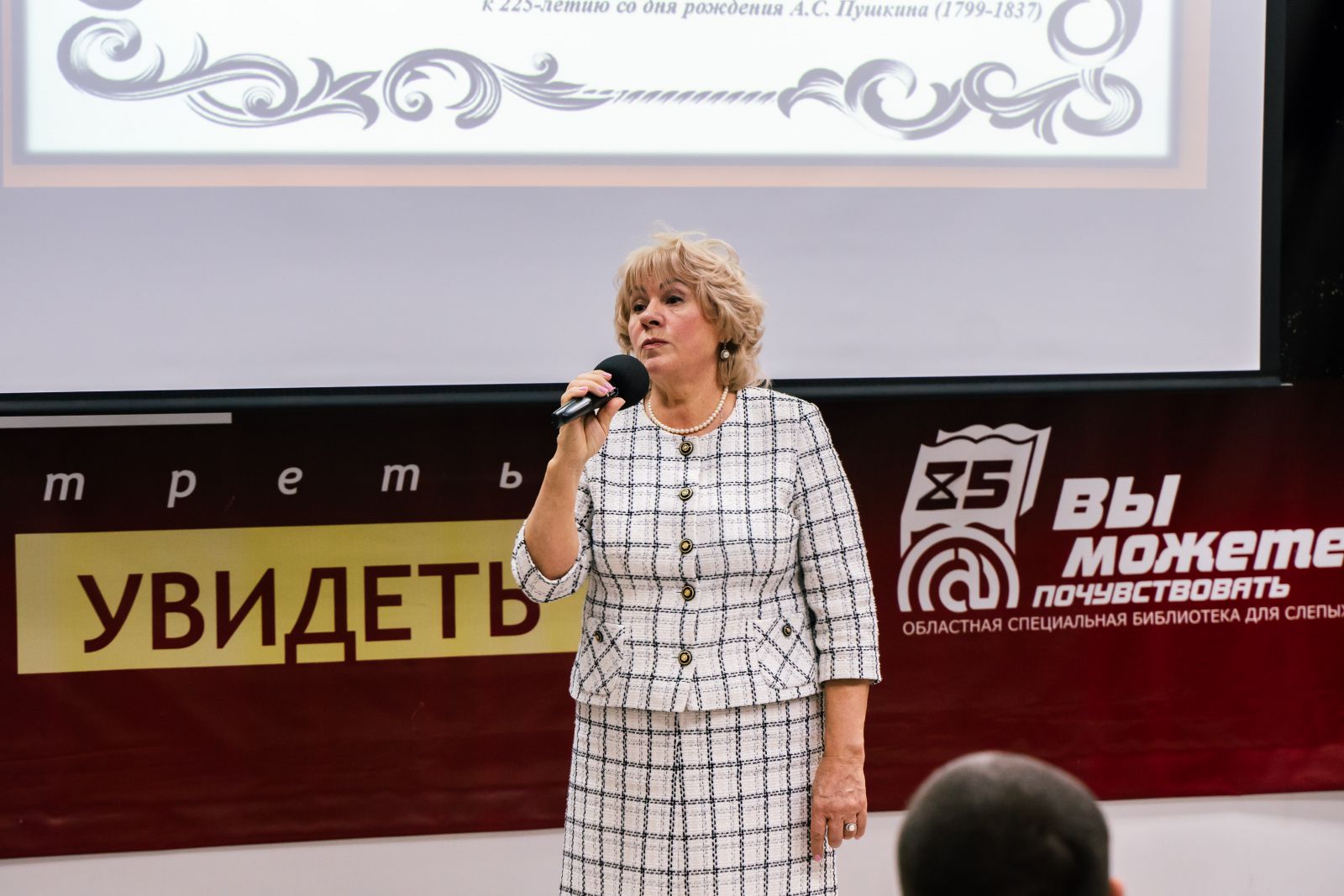 Зал библиотеки был торжественно оформлен. Была представлена книжная выставка, посвященная Международному дню инвалидов, в специальных и в плоскопечатных форматах. Гости и участники мероприятия смогли прикоснуться к творчеству людей с ограничениями по зрению на выставке рисунков «Удивительный мир Пушкина».