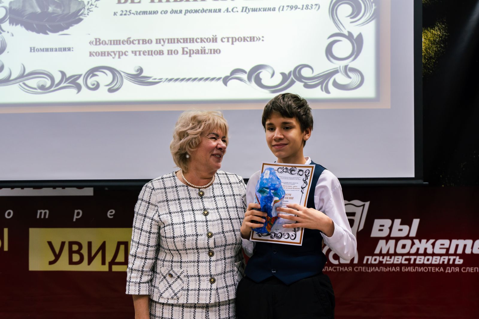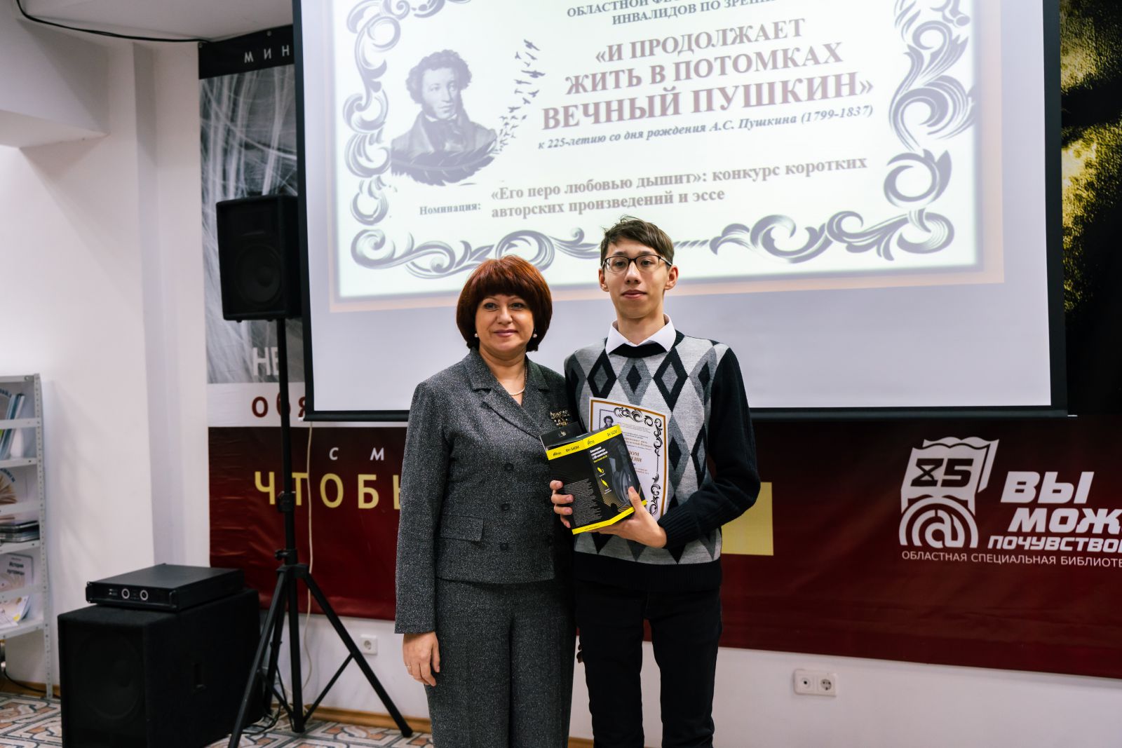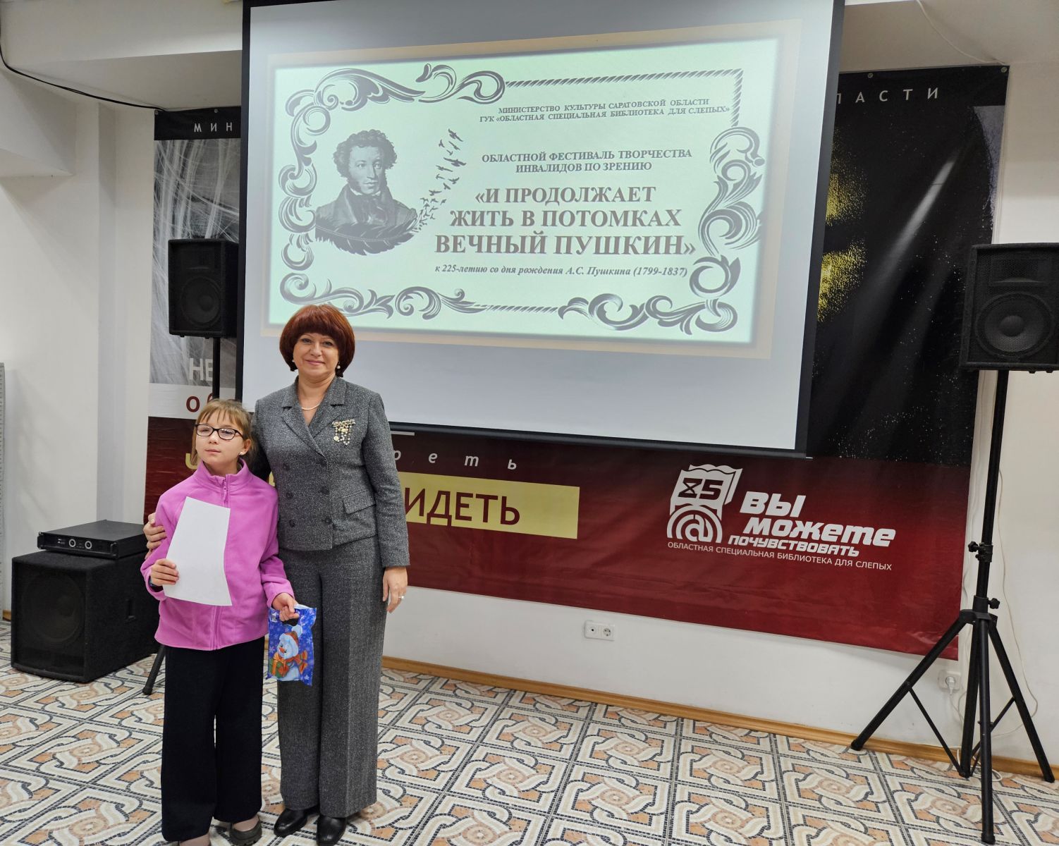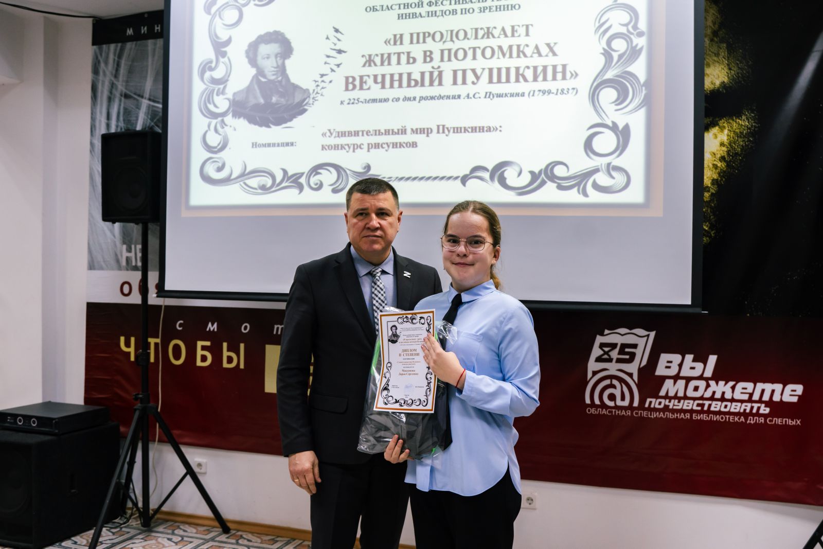 Состоялось торжественное награждение победителей областного фестиваля среди людей с нарушением зрения «И продолжает жить в потомках вечный Пушкин», посвящённого 225-летию со дня рождения русского поэта, писателя Александра Сергеевича Пушкина. Областной фестиваль проводился министерством культуры Саратовской области и ГУК «Областная специальная библиотека для слепых» по четырем номинациям в трех возрастных группах с мая по октябрь 2024 года.