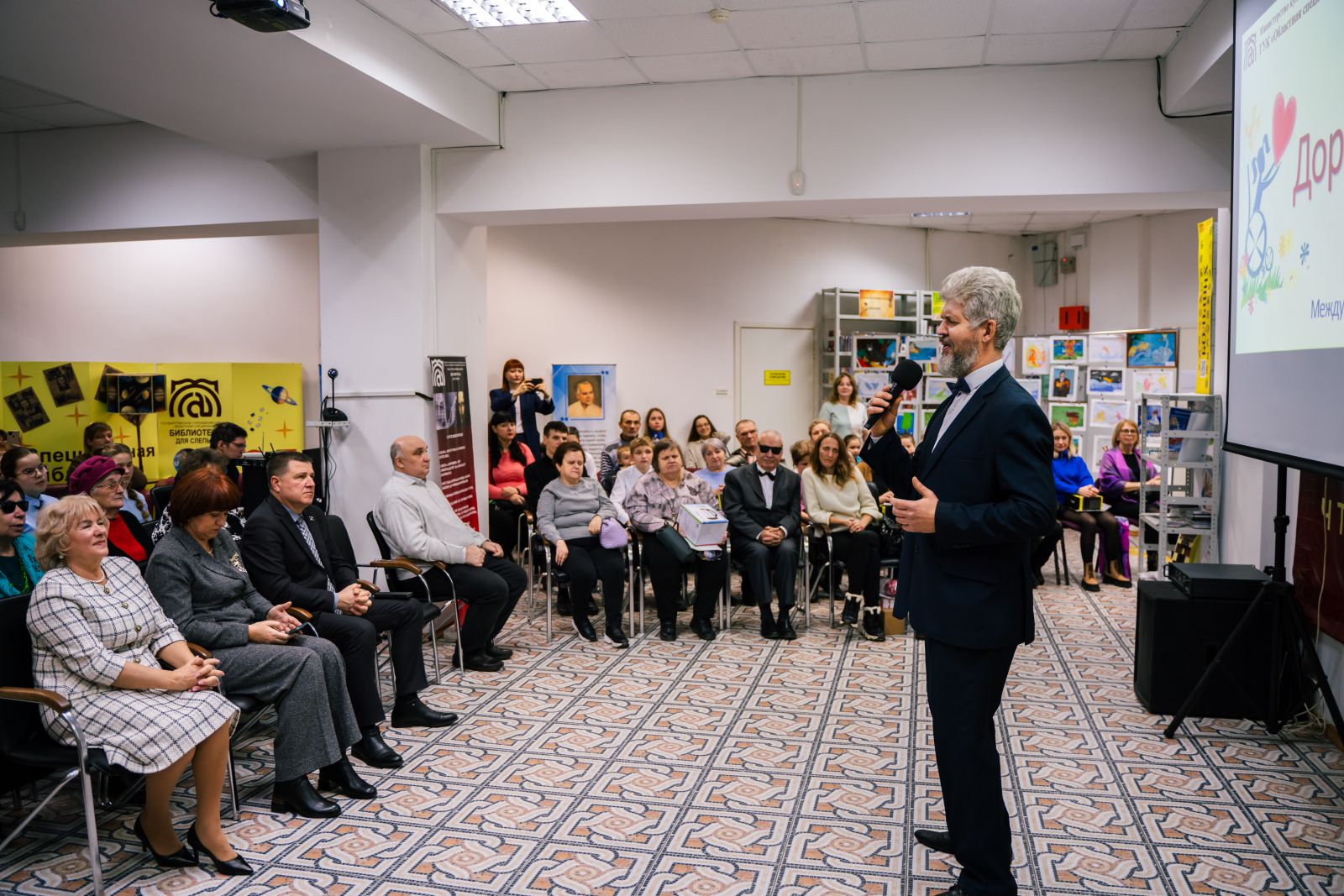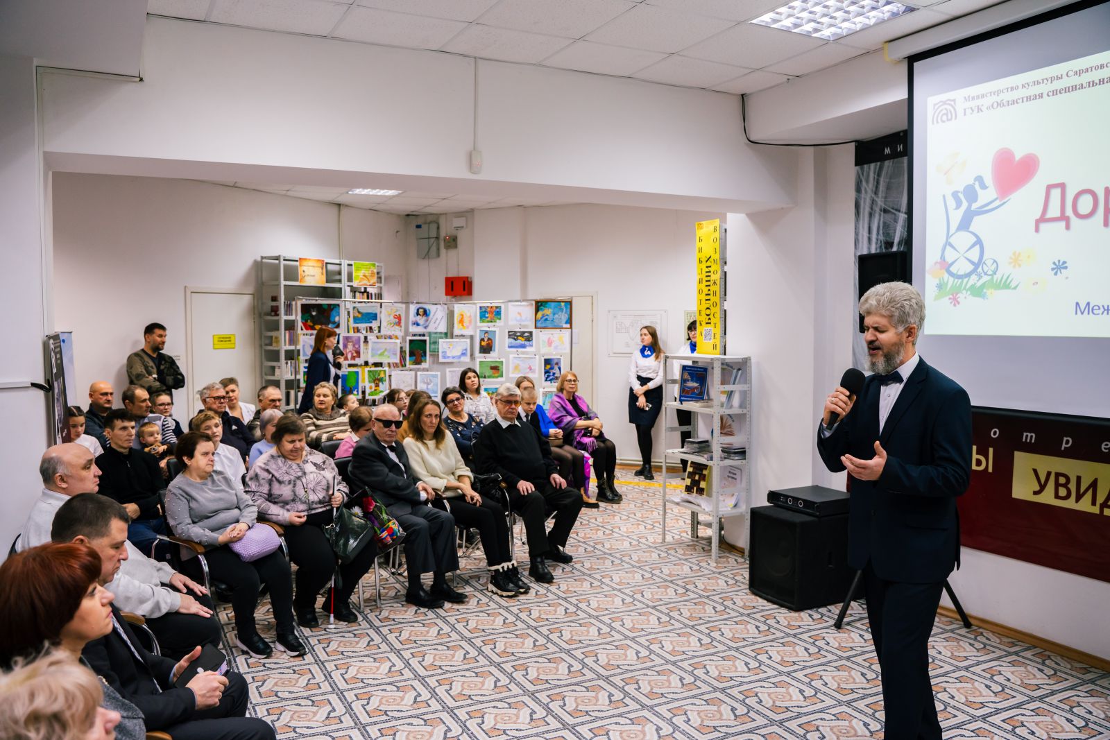 Ведущий мероприятия Артём Бондарев, заведующий сектором социокультурной реабилитации инвалидов, рассказал историю праздника.Он отметил, что в 2024 году тема Международного дня инвалидов – «Усиление лидерства людей с ограниченными возможностями для инклюзивного и устойчивого будущего», а символом этого дня является особый флаг, каждая полоса которого обозначает один из типов инвалидности: физическую, интеллектуальную, сенсорную.