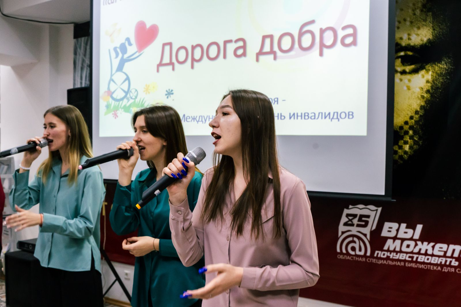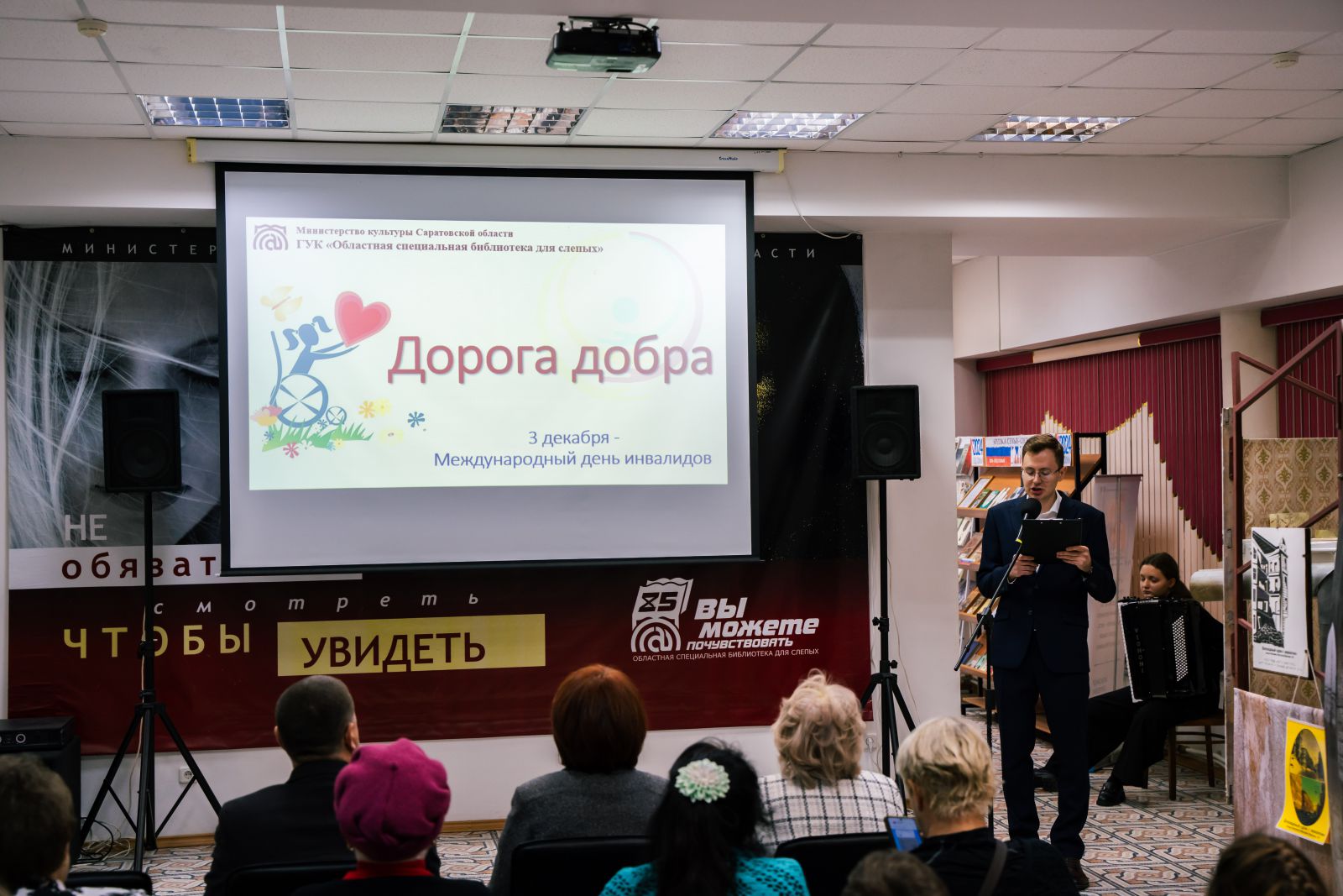 3 декабря, в Международный день инвалидов, в ГУК «Областная специальная библиотека для слепых» состоялось торжественное мероприятие «Дорога добра». В этот день Областная специальная библиотека для слепых стала центром притяжения не только для людей с нарушениями зрения, но и людей с другими ограниченными возможностями здоровья и всех тех, кто по зову сердца вместе с ними встречает этот день.