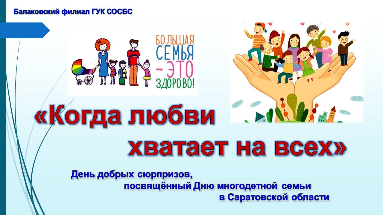 Утверждение этой даты помогает формировать положительный образ многодетной семьи, развивать лучшие традиции воспитания нравственно здорового поколения. В Саратовской области сегодня проживают 312 тысяч семей, в которых воспитываются 451 тысяча детей. Многодетных в регионе - 24 тысячи семей, в которых 79 тысяч детей.