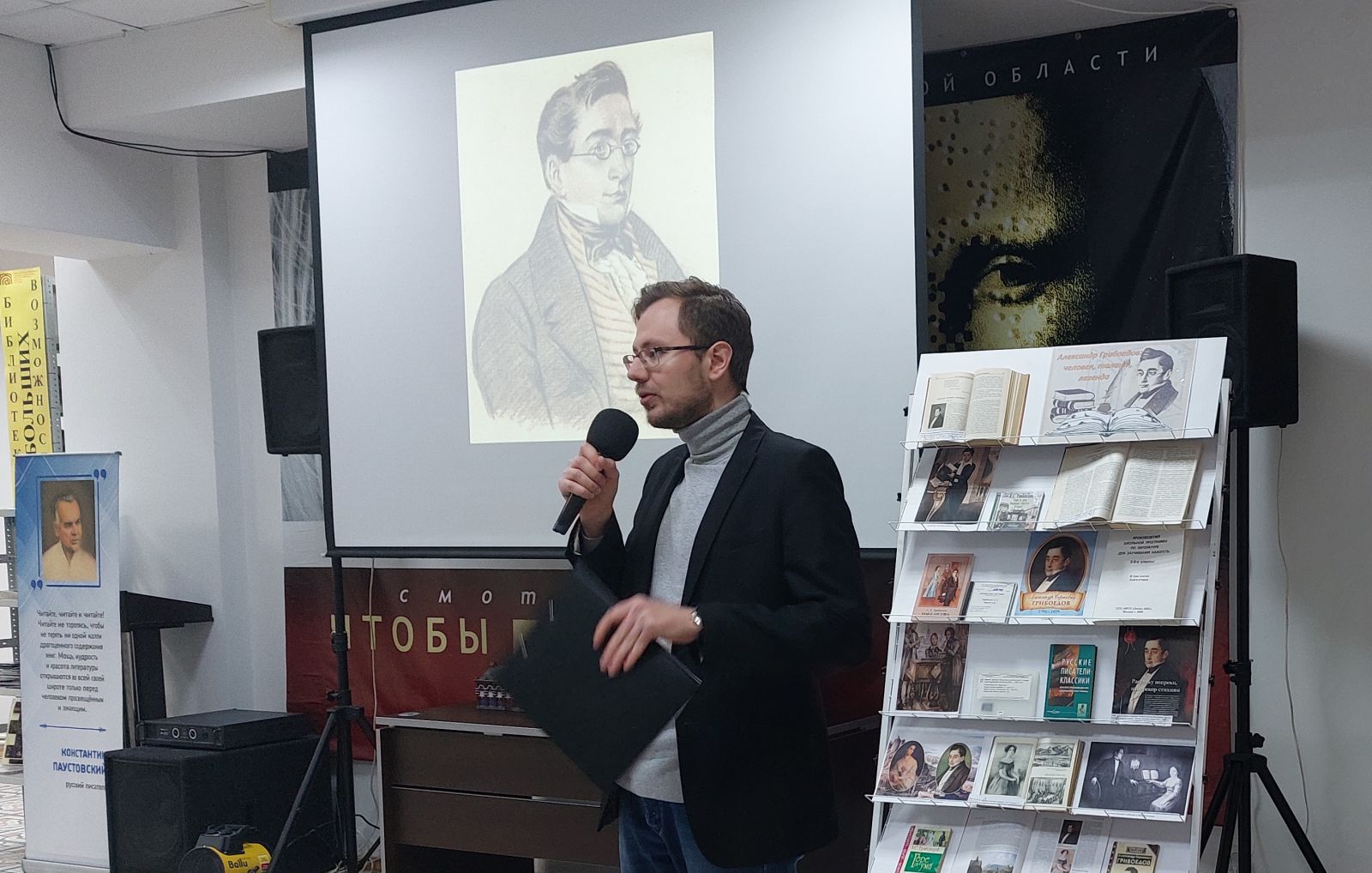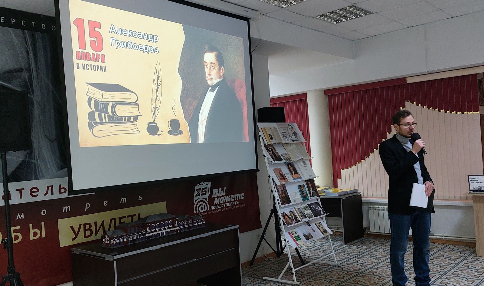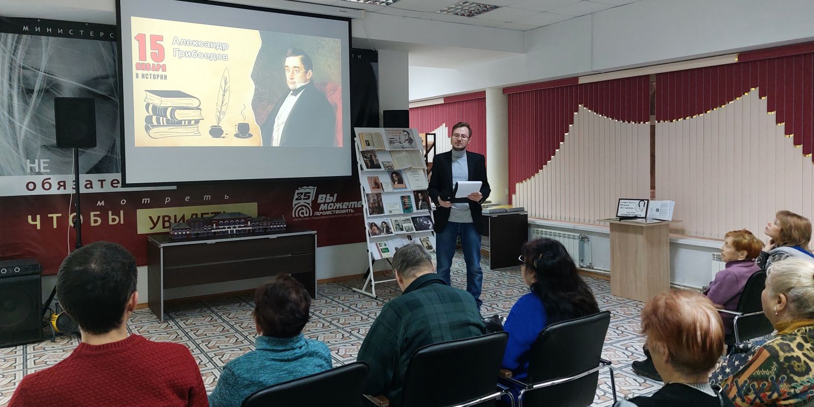 15 января в ГУК «Областная специальная библиотека для слепых» состоялась литературная гостиная, посвященная 230-летию со дня рождения русского писателя, поэта и дипломата А.С. Грибоедова. Заведующий сектором социокультурной реабилитации инвалидов Артем Бондарев рассказал участникам мероприятия о жизни и творчестве Александра Грибоедова, влиянии на российскую культуру и значении его произведений. Читатели с интересом слушали об удивительной любви писателя к Нине Чавчавадзе и трагической гибели в Персии, где он выполнял свои дипломатические обязанности.