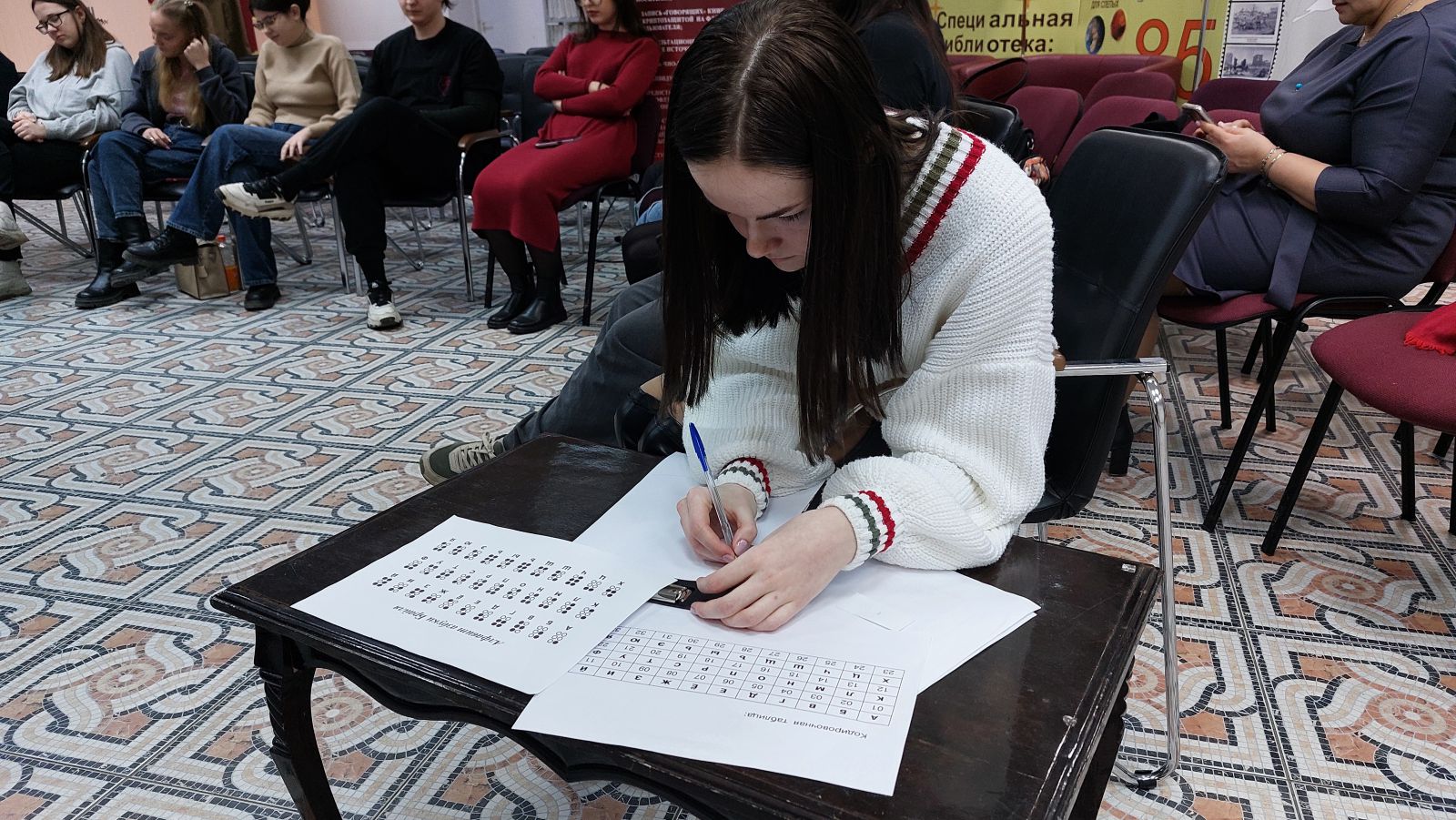 Заведующий сектором социокультурной реабилитации инвалидов ГУК СОСБС Артем Бондарев рассказал участниками мероприятия о способах восприятия информации людьми с ограниченными возможностями зрения, о правилах общения зрячих людей с людьми с нарушением зрения или слепыми: как общаться, сопровождать, помогать. Ребята познакомились с техникой чтения шрифта Брайля. В ходе квеста участники выполняли разнообразные задания, используя различные органы чувств, кроме зрения.