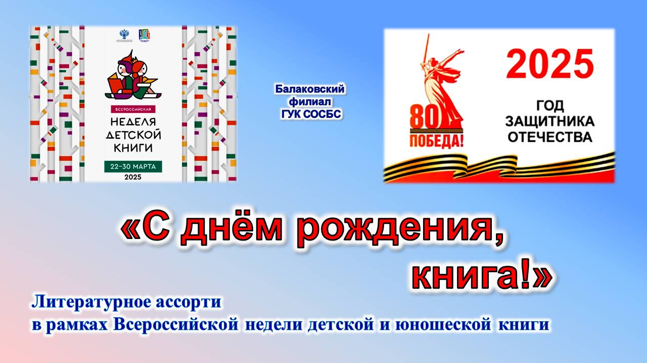 Неделя детской и юношеской книги – ежегодная Всероссийская акция, направленная на популяризацию литературы для детей – в 2025 году проходит с 22 по 30 марта под лозунгом «История с продолжением» и посвящена 80-летию Победы в Великой Отечественной войне и Году защитника Отечества в Российской Федерации. В рамках Недели детской книги по всей стране проходят встречи с поэтами и писателями, художниками-иллюстраторами, презентации книг, литературные чтения, мастер-классы, показы фильмов и спектаклей, викторины и другие мероприятия, связанные с детской книгой и чтением.