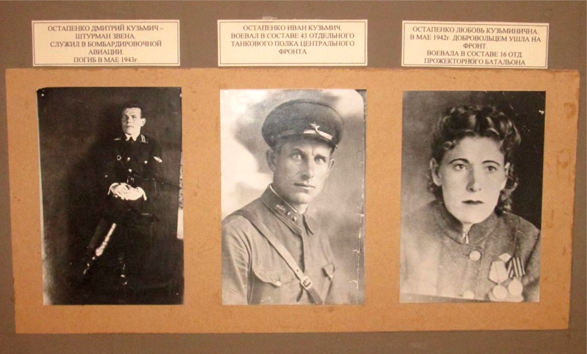 Школьникам рассказали о балаковской семье Остапенко, трое братьев из которой отдали свою жизнь в битве за Родину (один из них - Степан Кузьмич – Герой Советского Союза), а их сестра Любовь Кузьминична, ушедшая добровольцем на фронт, защищала в ноябре 1942 года саратовское небо в составе 16-го отдельного прожекторного батальона старшим слухачом на звукоулавливателе. После окончания войны Любовь Остапенко, окончив педагогический институт, работала учителем в школах района, в том числе проработала учителем в коррекционной школе-интернате (в которой сейчас учатся участники экскурсии) более 30 лет, получив звание ветерана педагогического труда.