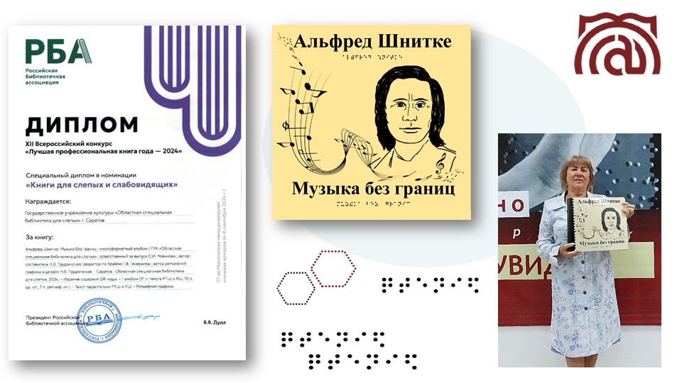 Особый интерес у участников конференции вызвала презентация многоформатного альбома «Альфред Шнитке. Музыка без границ», изданный отделом издательских и медиатехнологий ГУК СОСБС. Альбом приурочен к 90-летию со дня рождения композитора Альфреда Шнитке. Издание содержит информацию о жизни и творчестве нашего земляка, великого композитора Альфреда Гарриевича Шнитке. На ежегодном конкурсе РБА «Лучшая профессиональная книга года» в специальной номинации «Книги для слепых и слабовидящих» данный альбом отмечен специальным дипломом.