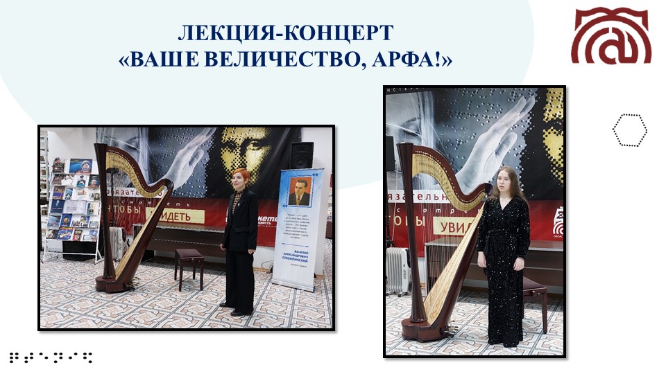 В дни месячника Белой трости в ГУК «Областная специальная библиотека для слепых» состоялась лекция-концерт «Ваше величество, Арфа!». В рамках лекции-концерта преподаватель Детской музыкальной школы для одаренных детей при Саратовской государственной консерватории имени Л.В. Собинова рассказала о специфике игры на арфе, что этот музыкальный инструмент в освоении самый сложный для незрячего музыканта.