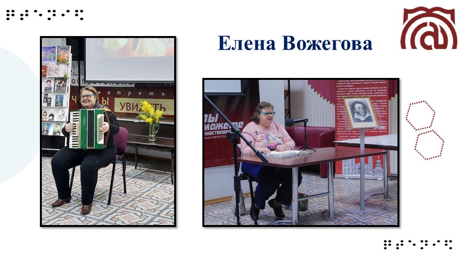 Незрячие люди способны овладеть практически всеми музыкальными инструментами. Но наиболее популярными из них являются фортепиано, баян, аккордеон. Наша читательница Елена Вожегова окончила музыкальную школу по классу аккордеон, Саратовское музыкальное училище, Государственный специализированный институт искусств города Москвы. В 2002 году записала в студии «Московские окна» диск авторской песни.