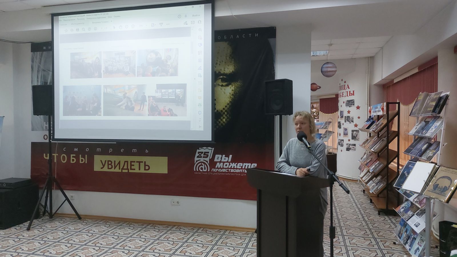 Для почетных гостей директор ГУК «Областная специальная библиотека для слепых» Ольга Ивановна Новикова провела экскурсию по библиотеке. В ходе визита почетные гости познакомились с тактильной выставкой «Вижу космос». Особое впечатление на почетных гостей произвела иммерсивная тактильная выставка «Прикоснись к подвигу!» и книжно-иллюстративная выставка «Время героев не проходит!».