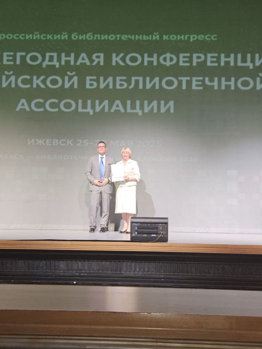 29 мая на торжественном закрытии Всероссийского библиотечного конгресса: XXIX Ежегодной Конференции Российской библиотечной ассоциации (Ижевск, 26–29 мая 2025 года) директор ГУК «Областная специальная библиотека для слепых» Ольга Новикова награждена Почётной грамотой Российской библиотечной ассоциации за вклад в развитие общественно-профессионального библиотечного движения в России. Награду вручил Президент Российской библиотечной ассоциации Вадим Валерьевич Дуда. В зале присутствовала заместитель культуры Российской Федерации Жанна Владимировна Алексеева. Ижевск – библиотечная столица России 2025.
