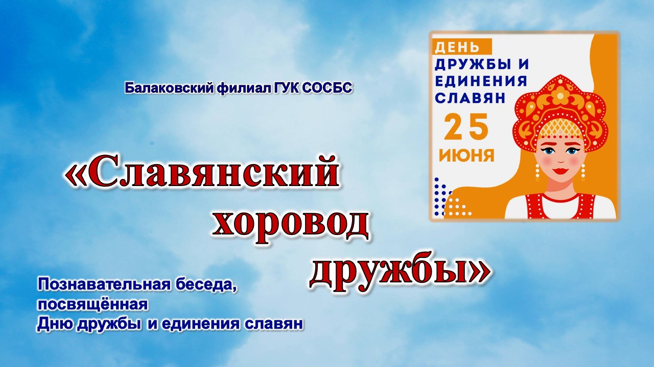 Балаковский филиал ГУК «Областная специальная библиотека для слепых» предлагает вашему вниманию познавательную беседу «Славянский хоровод дружбы», посвящённую Дню дружбы и единения славян. День дружбы и единения славян служит напоминанием о многовековых связях между славянскими народами, их общем историческом пути и культурном наследии. В условиях современного мира этот праздник приобретает особое значение, способствуя сохранению культурной идентичности славянских народов и развитию конструктивного диалога между славянскими государствами. Дружеские отношения между славянскими странами должны развиваться и поддерживаться постоянно!