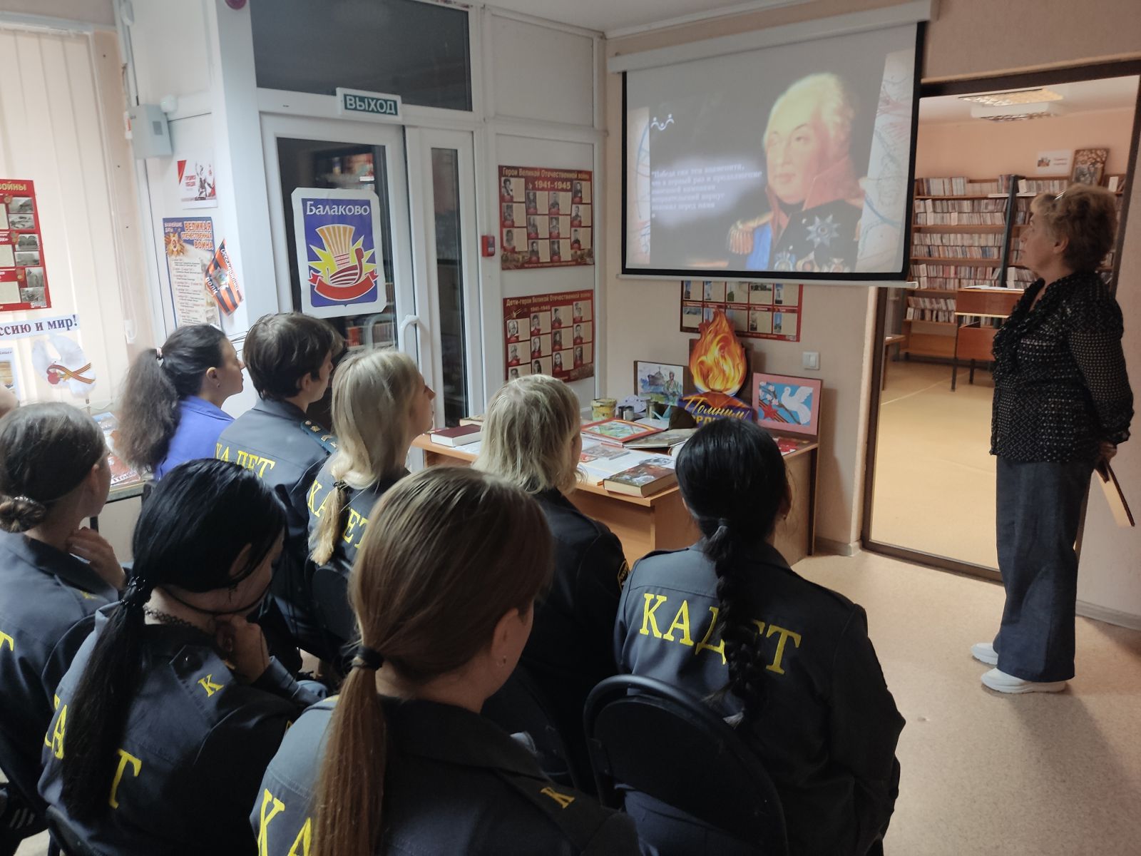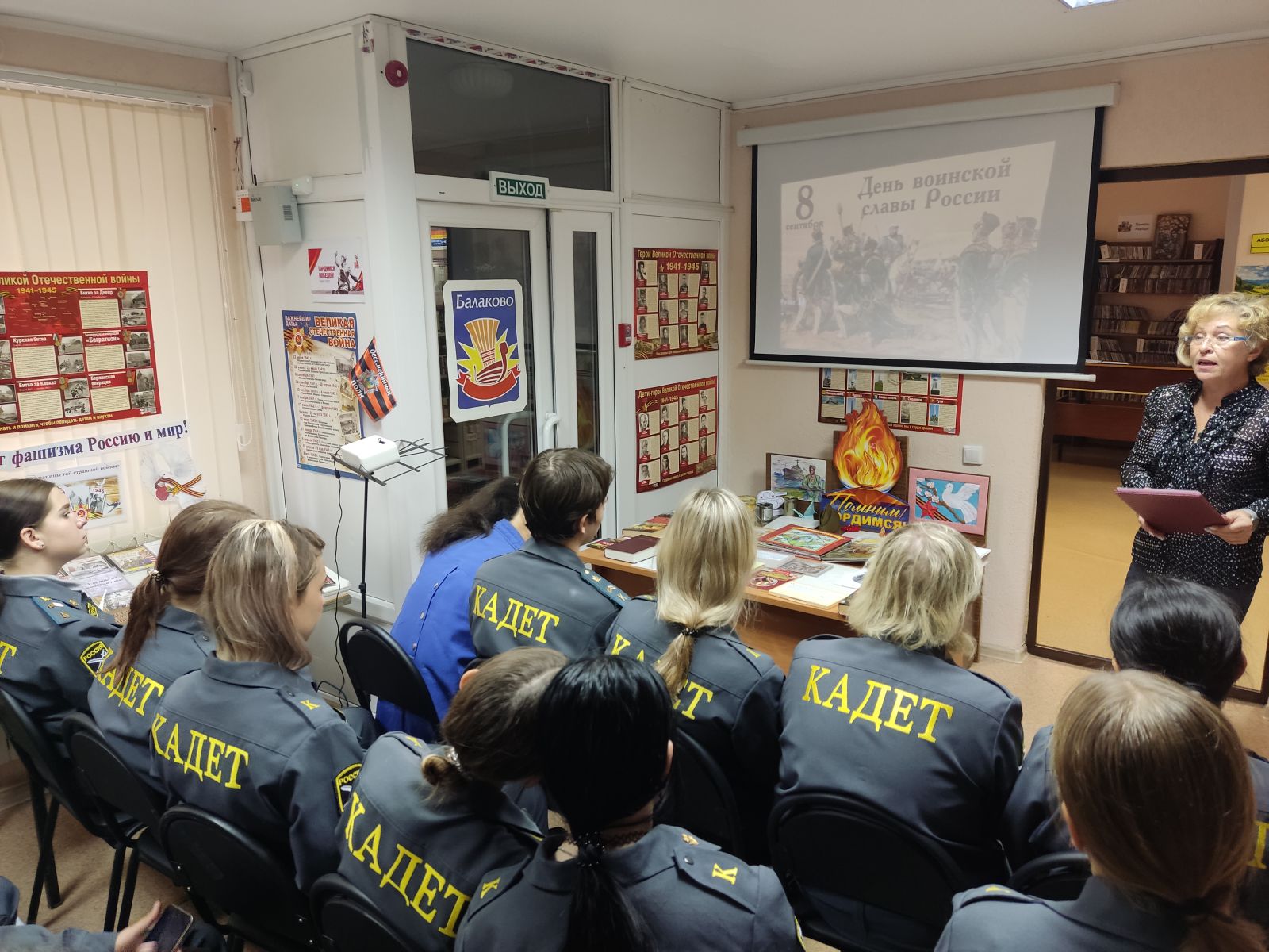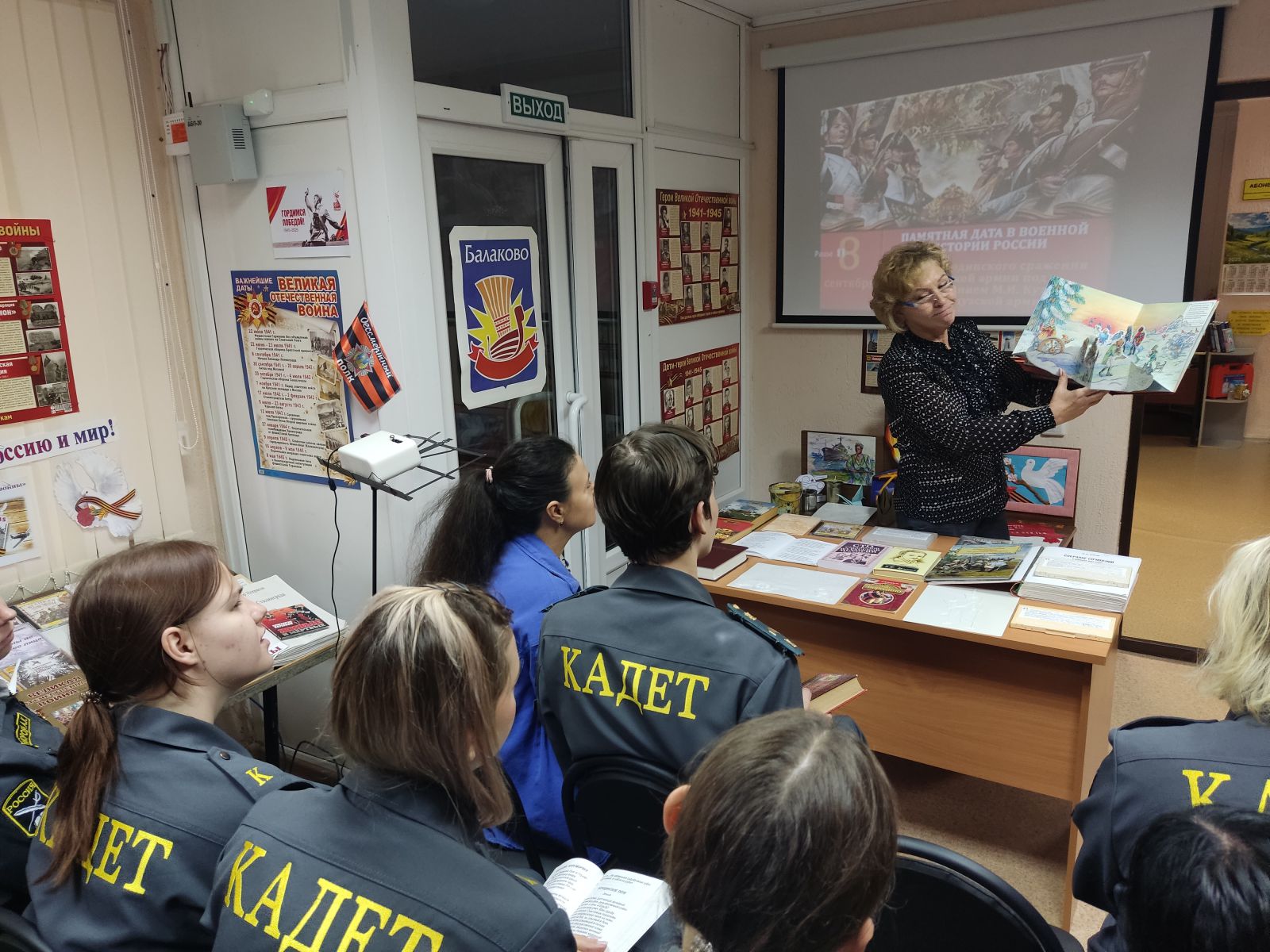Балаковский филиал Областной специальной библиотеки для слепых подготовил для студентов ГАПОУ СО «Губернаторский колледж» панораму исторических событий «О Родине, о доблести, о славе», посвящённую Дню Бородинского сражения русской армии под командованием М. И. Кутузова с французской армией. Сотрудники рассказали о событиях Отечественной войны 1812 года, о главном сражении под Бородино, о легендарном полководце М. Кутузове, о прославленных героях П. Багратионе, Н. Раевском, Д. Давыдове, Н. Дуровой и других. Мультимедийная презентация и видеоматериалы помогли кадетам познакомиться с ключевыми событиями Бородинского сражения, больше узнать об истории нашего государства в этот период, ознакомиться с книгами специальной библиотеки для слепых разных форматов и на разных носителях, рассказывающих об огромном значении Бородинской битвы для российской и общемировой истории, и с книжно-иллюстративной выставкой «Наш народ – великий воин! Славы предков будь достоин!», посвящённой Году защитника Отечества.